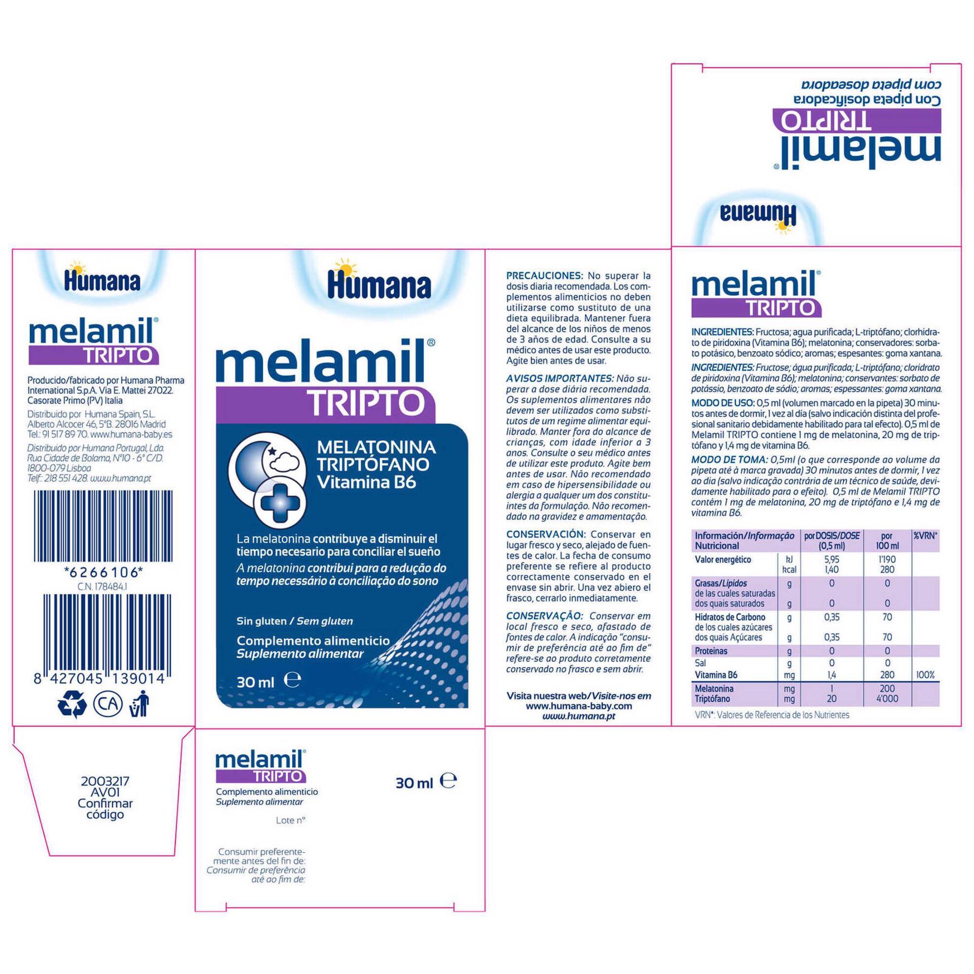 Ingredientes: Frutose, água purificada, L-triptofano, cloro-hidrato de piridoxina (vitamina B6), melatonina, aromas.