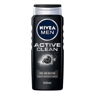 Para corpo, rosto e cabelo: NIVEA MEN Gel de Duche Active Clean, 500 ml.