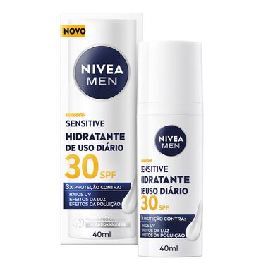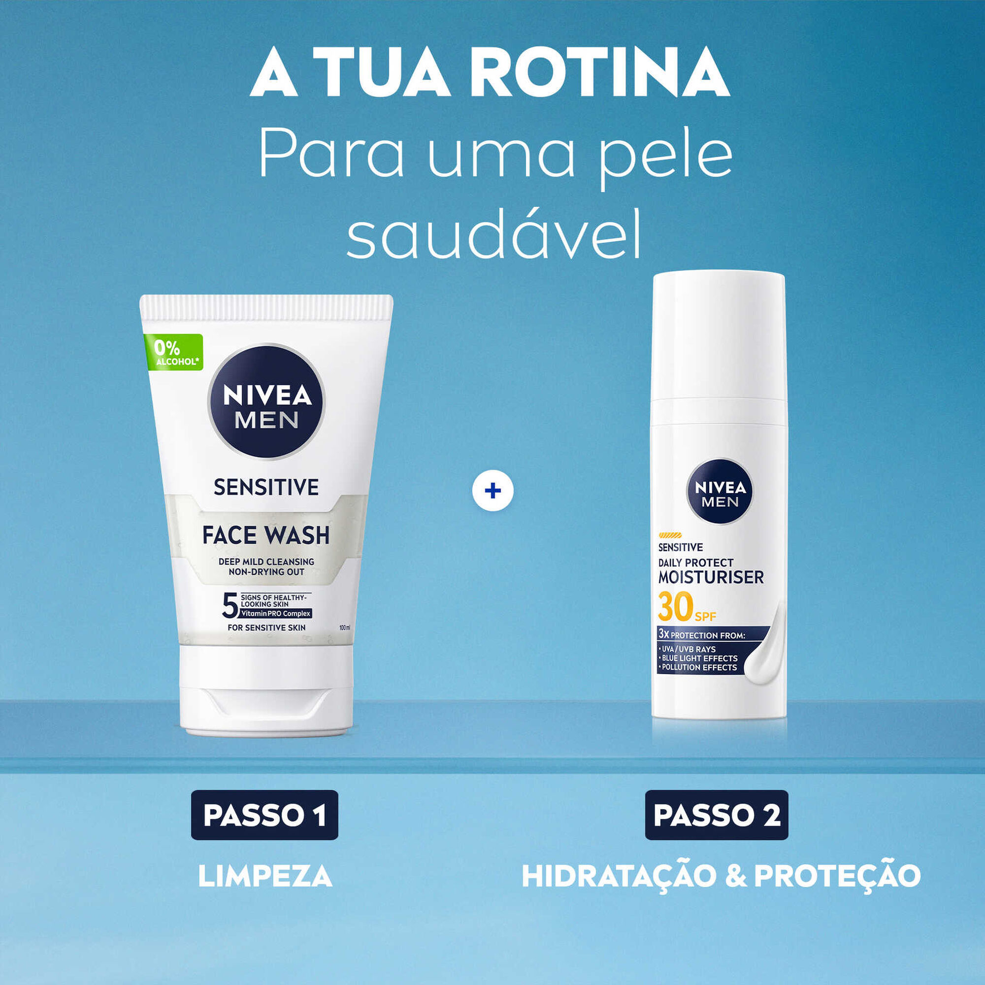 O NIVEA MEN Creme de Uso Diário Sensitive FP30 oferece um cuidado avançado para a pele sensível com uma fórmula de tripla proteção. Enriquecido com VitaminPRO Complex (Vitamina E e Pró-Vitamina B5) e antioxidantes, este hidratante leve e de rápida absorção protege a pele contra raios UVA/UVB, efeitos da luz azul e poluição.