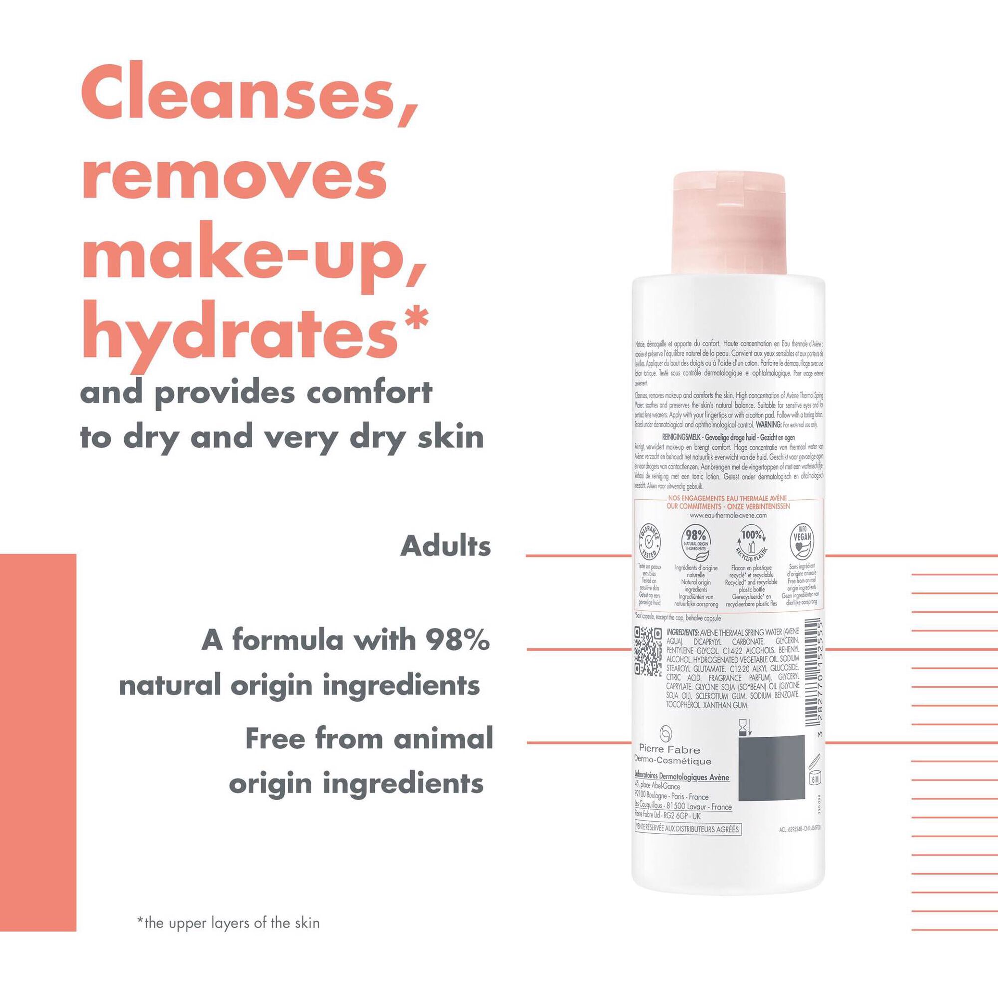 Contém uma fórmula enriquecida com ingredientes ativos hidratantes e água termal d'Avène que reduz as irritações.