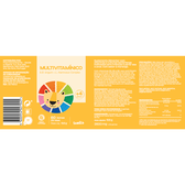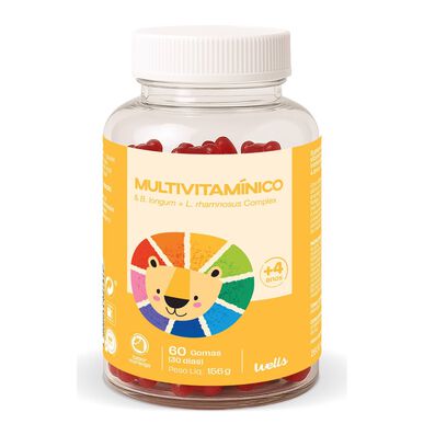 Suplemento alimentar com vitaminas e culturas bacterianas inativas para crianças a partir dos 4 anos. Com sabor a morango.