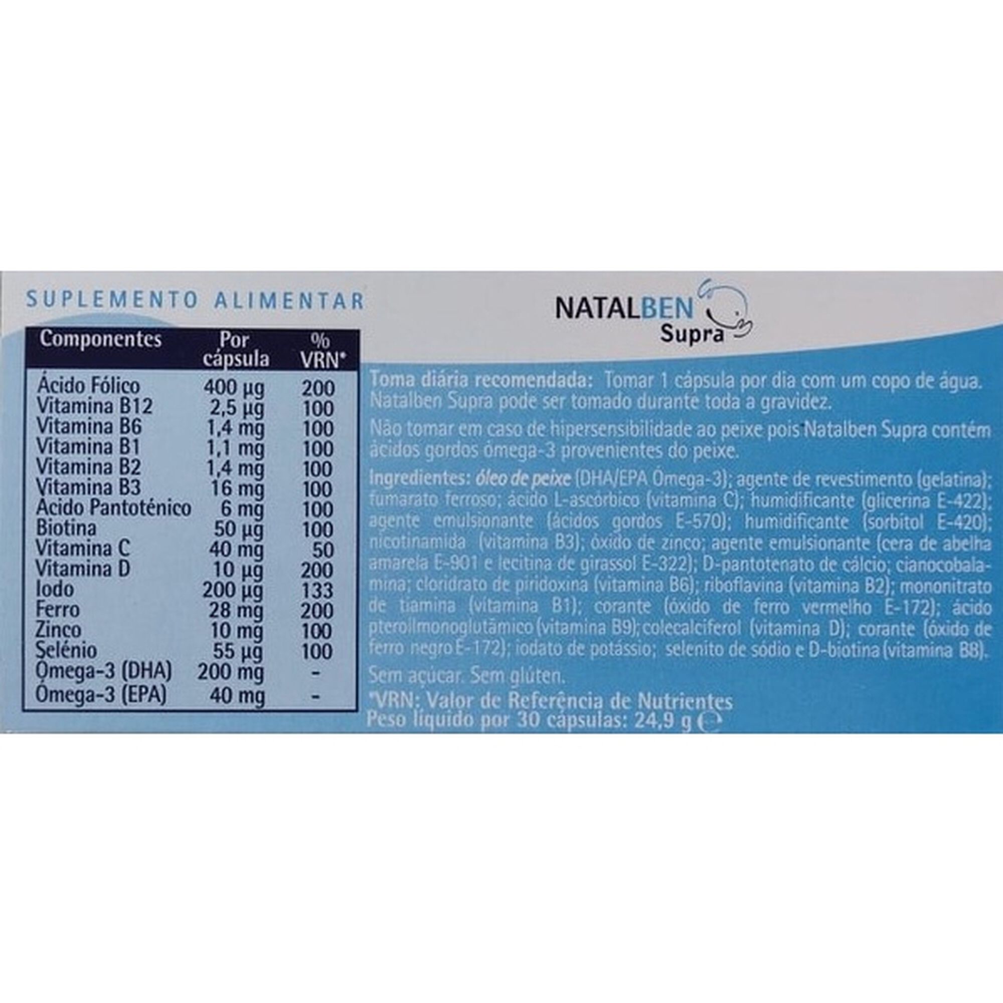 Natalben Supra é um suplemento alimentar essencial por conter as quantidades adequadas de Ácido Fólico + Vitamina B12 + Iodo + Omega 3, que contribuem para o desenvolvimento neurológico fetal.