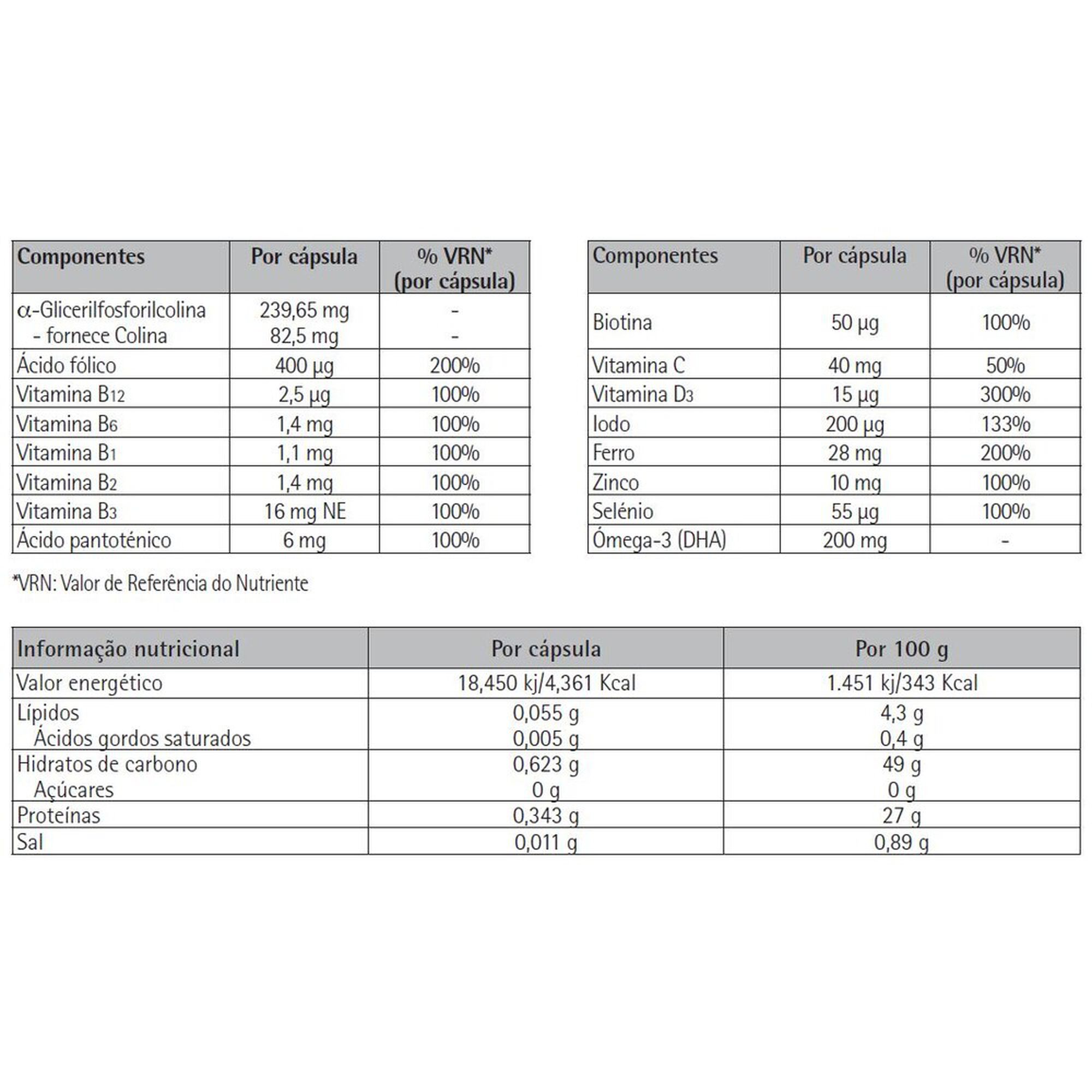 ÓLEO DE PEIXE; GELATINA; ALFOSCERATO DE COLINA; GLICERINA E-422; FOMARATO FERROSO; VITAMINA C; CERA DE ABELHAS AMARELA E-901; LECITINA DE GIRASSOL E-322; MONO E DIGLICERIDOS DE ACIDOS GORDOS E-471; VITAMINA B3; OXIDO DE ZINCO; D-PANTOTENATO DE CALCIO; OXIDO DE FERRO VERMELHO E-172; VITAMINA B12; B6; B2; B1; D3; OXIDO DE FERRO PRETO E-172; VITAMINA B9; IODATO DE POTASSIO; SELENITO DE SODIO E VITAMINA B8.