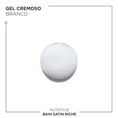 Bain Satin Riche possui uma textura de gel branco cremoso, espumoso e sem fricção.