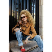 A modelo da fotografia está a usar os óculos de sol Solestice Blush Brown e o modelo os óculos de sol Solestice Green Savana.