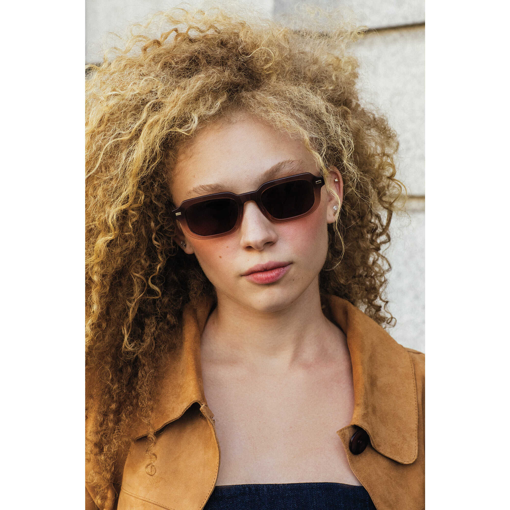 A modelo da fotografia está a usar os óculos de sol Solestice Blush Brown e o modelo os óculos de sol Solestice Green Savana.