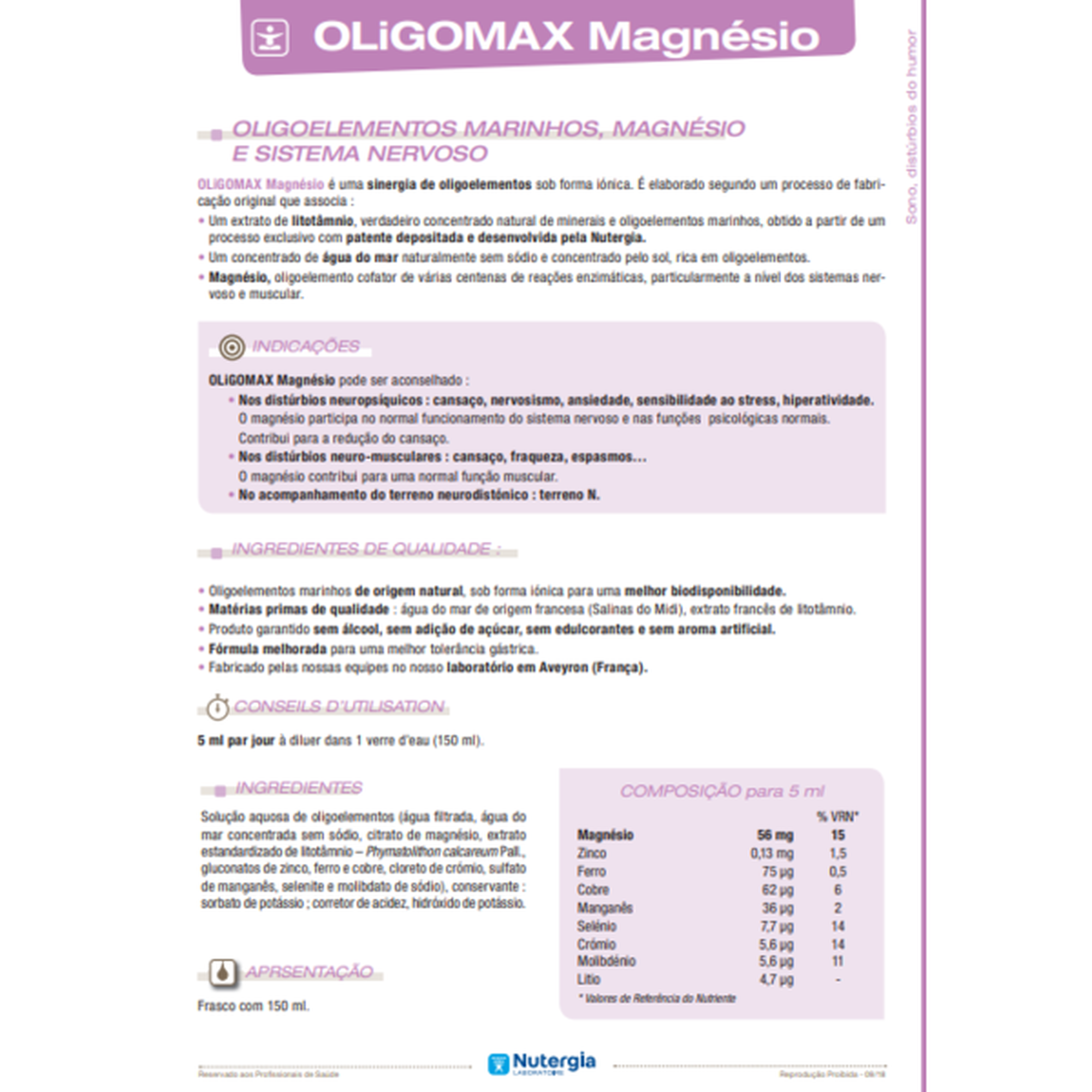OLiGOMAX Magnésio é uma sinergia de oligoelementos sob forma iónica. Aconselhado: Nos distúrbios neuropsíquicos : cansaço, nervosismo, ansiedade, sensibilidade ao stress, hiperatividade.