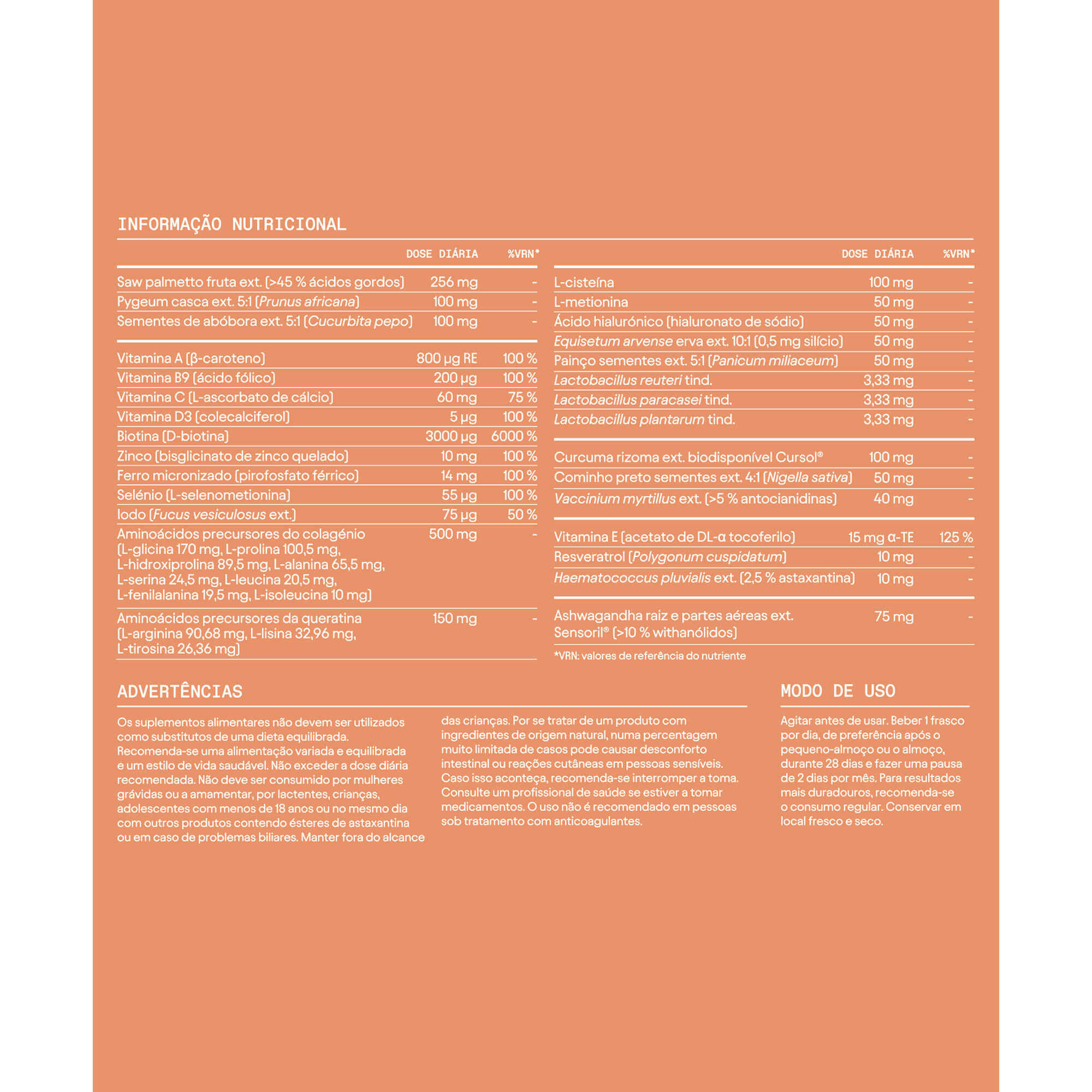 Agitar antes de usar. A caixa contém 28 frascos. A dose diária recomendada é beber um frasco por dia durante 28 dias e descansar dois dias por mês.