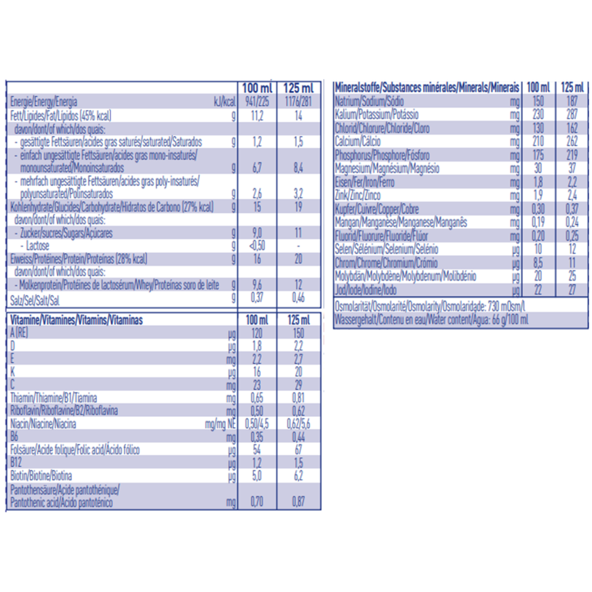 Esta bebida possui uma forte concentração proteica, de qualidade superior, rico em leucina. Com elevada densidade energética, baixo indice glicémico e isento de glúten, esta bebida fornece todas as vitaminas, minerais e oligoelementos necessários para uma alimentação completa.