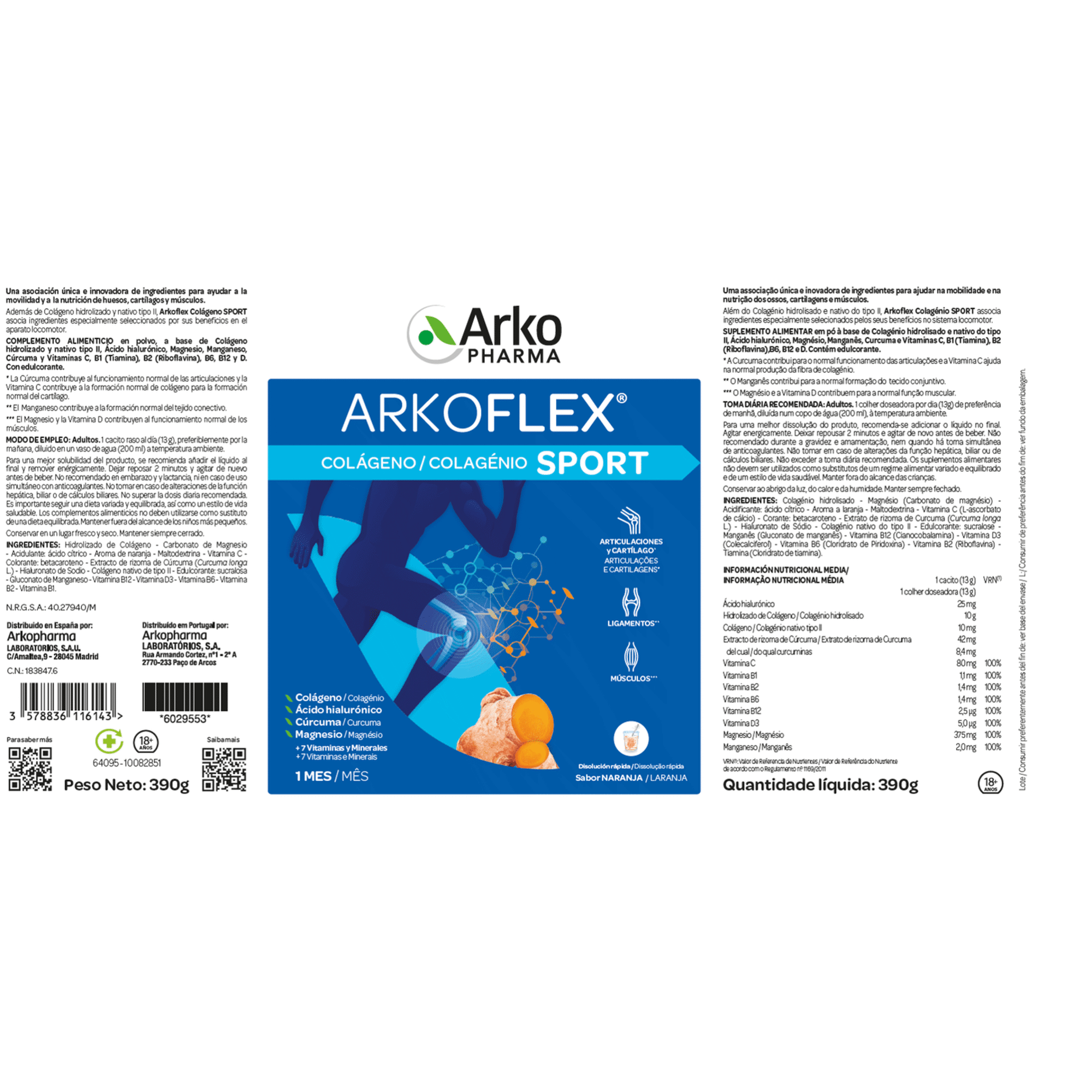 Arkoflex Colagénio Expert® é um suplemento alimentar em pó à base de Colagénio hidrolisado e tipo II nativo, Ácido Hialurónico, Magnésio, Manganês, Curcuma e Vitaminas C, B1 (Tiamina), B2 (Riboflavina),B6, B12 e D. Contém edulcorante.