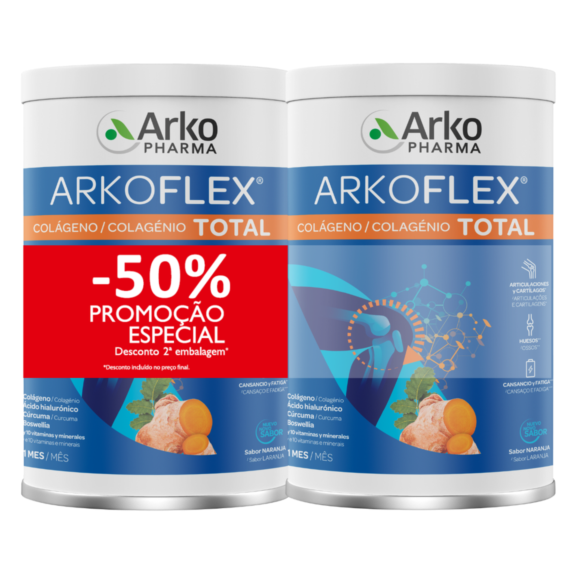 Suplemento alimentar em pó à base de Colagénio hidrolisado e Colagénio nativo tipo II, Ácido hialurónico, Magnésio, Manganês, Glucosamina, Condroitina, Litotâmnio, Boswellia, Curcuma e 7 Vitaminas.