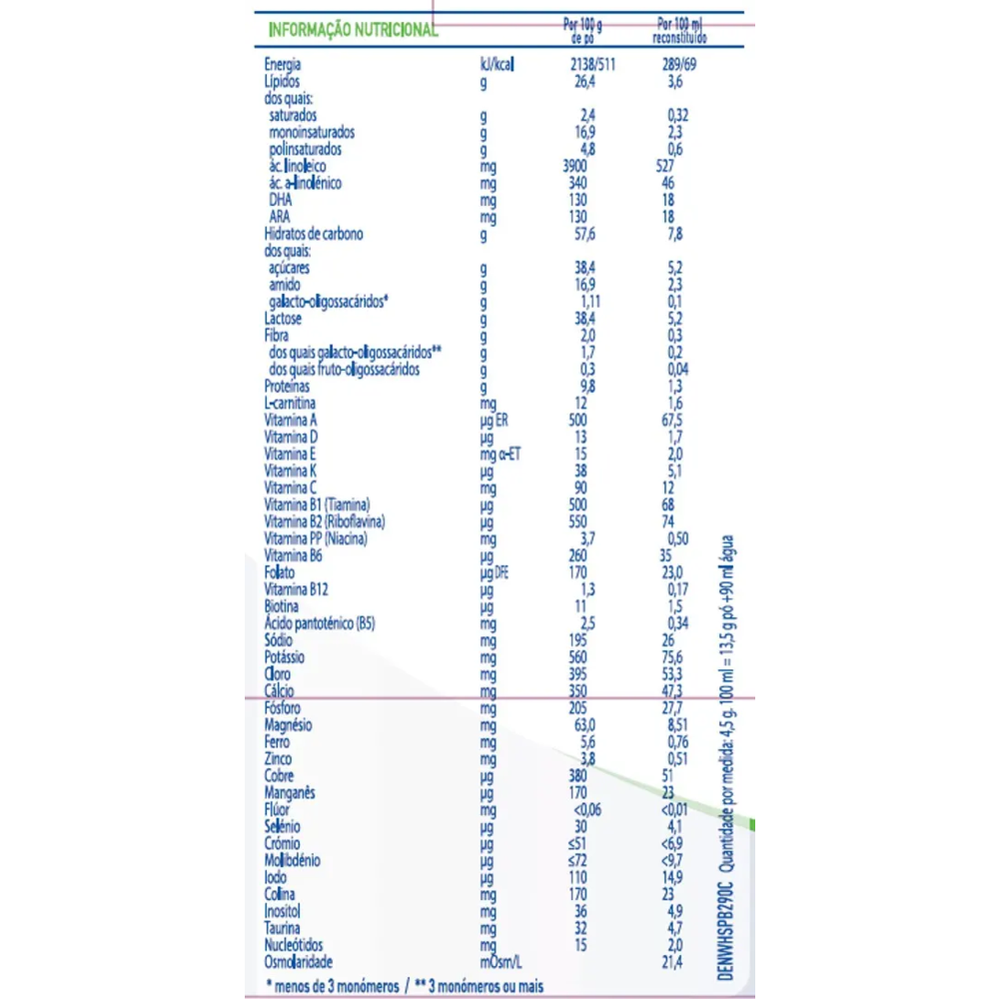 - GOS/FOS – Fibras solúveis indicadas para melhorar o trânsito intestinal e consistência das fezes;