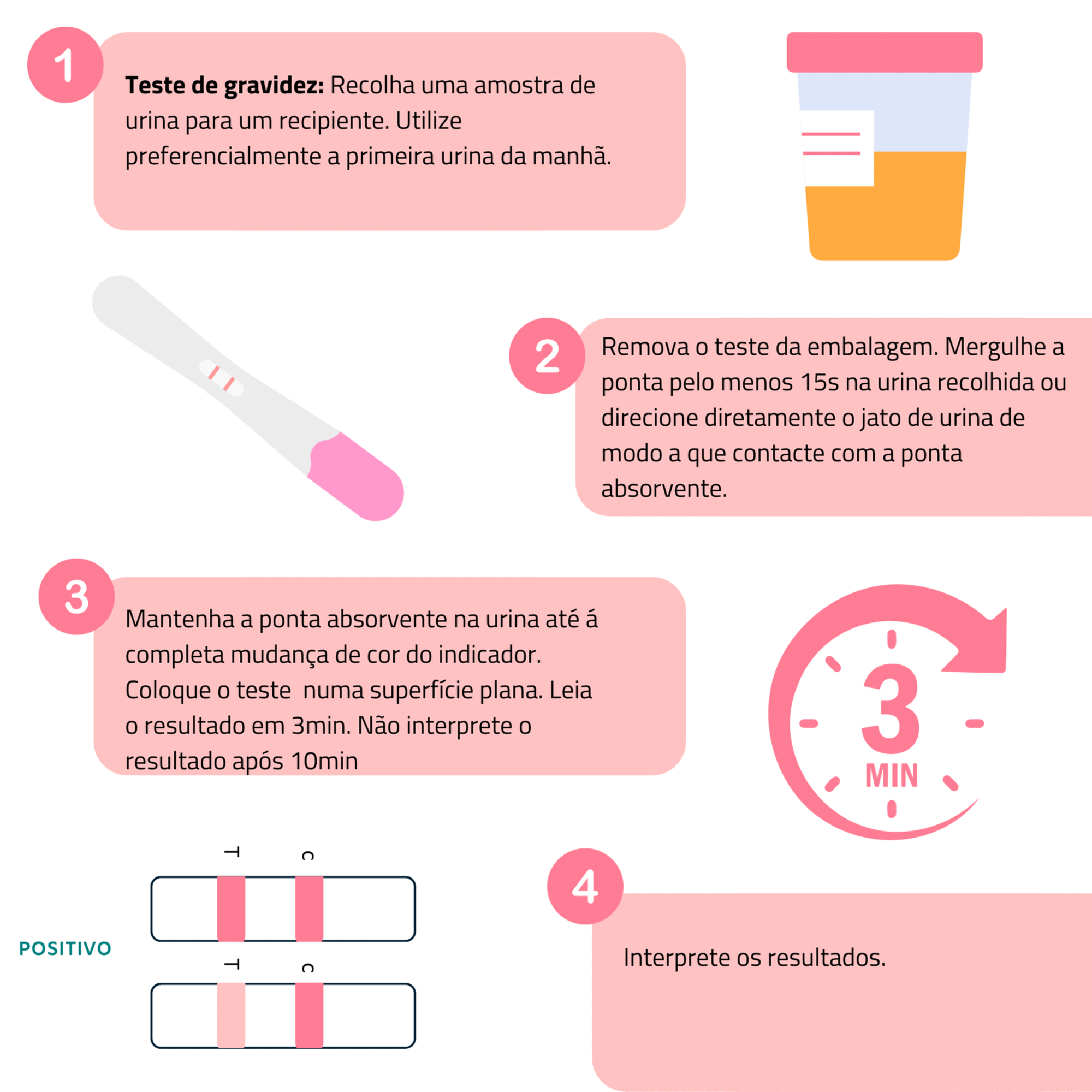 3- Coloque a tira numa superfície plana, limpa e seca e aguarde que as linhas coloridas apareçam. Leia o resultado em 5min. Não interprete o resultado após 10min.