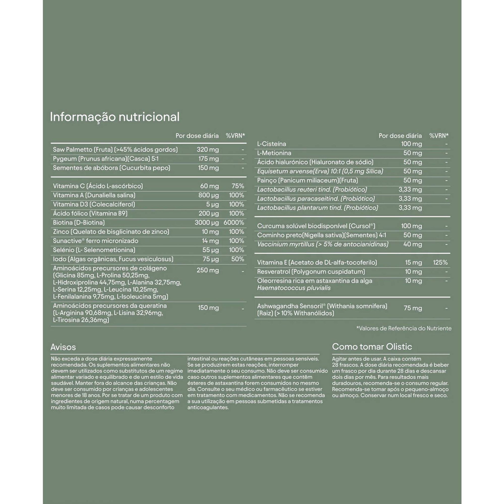 Olistic Men é a primeira fórmula bebível que aborda as 6 causas principais que provocam a queda do cabelo (predisposição genética e mudanças hormonais, deficiências nutricionais, inflamação crónica, fatores ambientais, stress psico-emocional e envelhecimento) e favorece o bem-estar geral da pessoa, uma vez que trabalha com a certeza de que o corpo e a mente estão relacionados.
