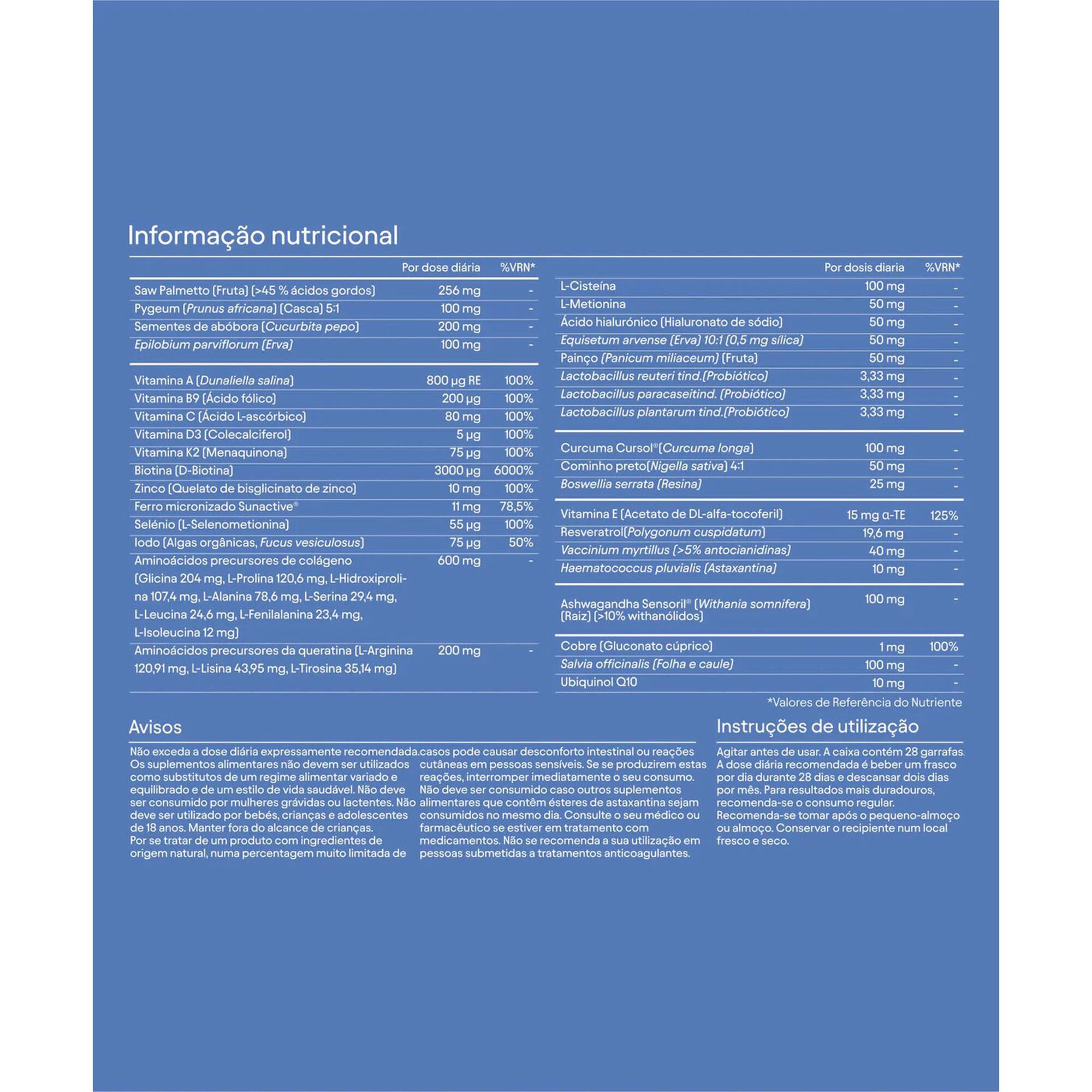 Água; Humidificante (glicerina); Frutose de uva; Aminoácidos precursores de colagénio (L-glicina, L-prolina, L-hidroxiprolina, L-alanina, L-serina, L-leucina, L-fenilalanina, L-isoleucina); Ext. de Saw palmetto (Serenoa repens, fruta); Aminoácidos precursores de queratina (L-arginina, L-lisina e L-tirosina); Ext. de sementes de abóbora (Cucurbita pepo, sementes); Ferro micronizado SunActive® (pirofosfato férrico); Aromas; Cursol® ext. de curcuma (Curcuma longa, rizoma); Sensoril® ext. de ashwagandha (Withania somnifera, raiz); Ext. de Pygeum (Prunus africana, casca); Ext. de Epilobium (Epilobium parviflorum, erva); L-cisteína; Ext. de sálvia (Salvia officinalis, folha e caule); Ácido L-ascórbico (vitamina C); Ext. de Fucus vesiculosus (0,1 % iodo), alga; Estabilizadores (celulose microcristalina, carboximetilcelulose de sódio) Ext. de Dunaliella salina, algas (7,5 % b-caroteno); Ácido hialurónico (hialuronato de sódio); Ext. de cavalinha (Equisetum arvense, erva); Ext. de cominho preto (Nigella sativa, sementes); Ext. de painço (Panicum miliaceum, semente); L-metionina; Estabilizadores (ésteres de sacarose de ácidos gordos); Acidificante (ácido cítrico); Ext. de mirtilo, >5 % antocianidinas (Vaccinium myrtillus, fruta); Menaquinona (vitamina K2); Bisglicinato de zinco; Acetato de DL-alfa-tocoferil (vitamina E); Ext. de Boswellia (Boswellia serrata, resina); Conservantes (sorbato de potássio, benzoato de sódio); Espessante (goma xantana); Ext. de Polygonum cuspidatum (98 % resvertarol); L-selenometionina; Ubiquinol Q10; Ext. de Haematococcus pluvialis (astaxantina); Gluconato cúprico; Lactobacillus plantarum tindalizado; Lactobacillus paracasei tindalizado; Lactobacillus reuteri tindalizado; Biotina (D-biotina); Ext. de Cladonia rangiferina (colecalciferol); Ácido fólico (ácido pteroilmonoglutâmico).