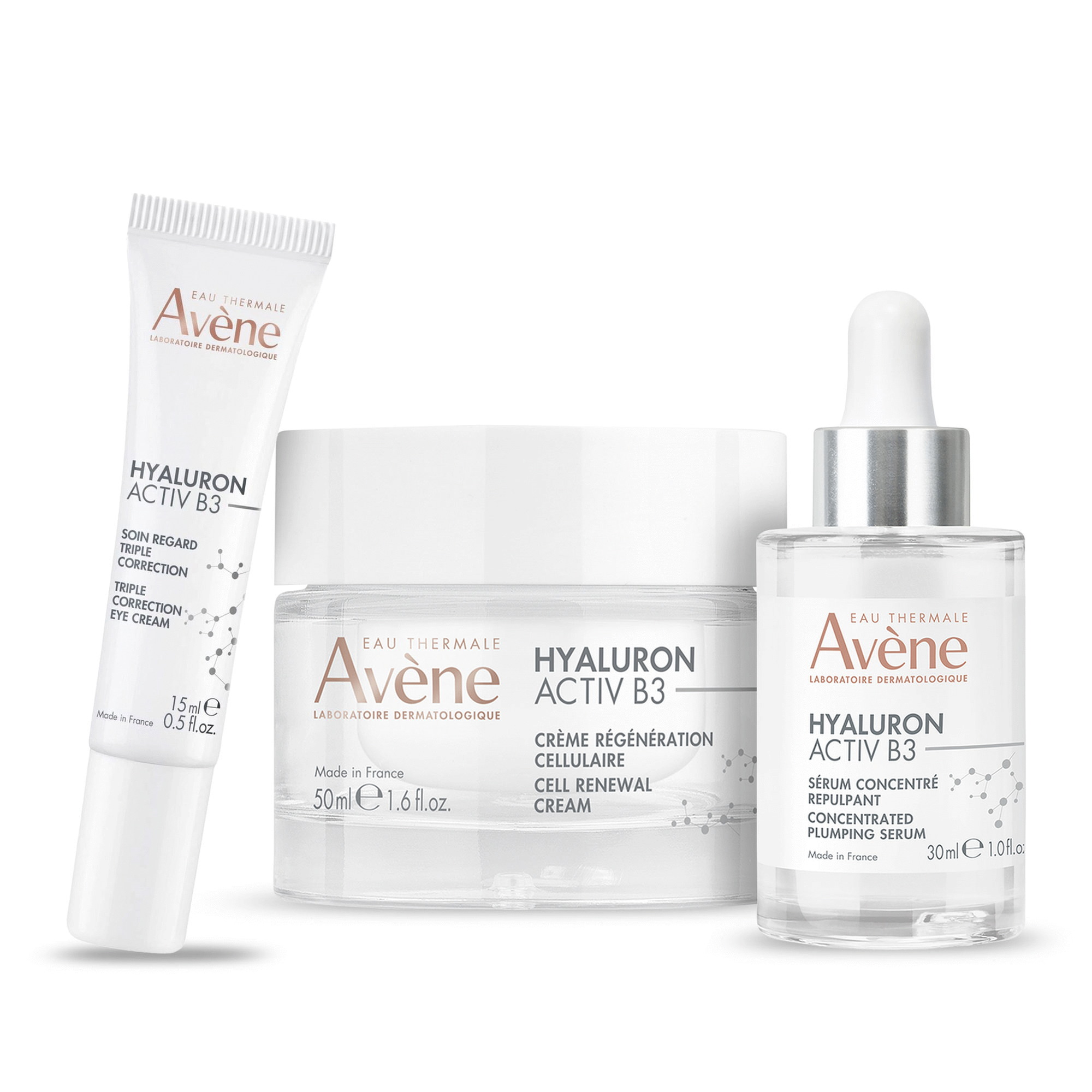 Hyaluron Activ B3 Triple Correction Eye Cream: AVENE THERMAL SPRING WATER (AVENE AQUA). CAPRYLIC/CAPRIC TRIGLYCERIDE. GLYCERIN. NIACINAMIDE. DICAPRYLYL ETHER. CARTHAMUS TINCTORIUS (SAFFLOWER) SEED OIL (CARTHAMUS TINCTORIUS SEED OIL). MYRISTYL ALCOHOL. SODIUM DEXTRAN SULFATE. SODIUM HYALURONATE. TERMINALIA CHEBULA FRUIT EXTRACT. ADENOSINE. CETEARYL OLIVATE. CITRIC ACID. CITRUS LIMON (LEMON) PEEL POWDER (CITRUS LIMON PEEL POWDER). GLYCERYL BEHENATE. GLYCERYL DIBEHENATE. HELIANTHUS ANNUUS (SUNFLOWER) SEED OIL (HELIANTHUS ANNUUS SEED OIL). MYRISTYL GLUCOSIDE. SCLEROTIUM GUM. SODIUM BENZOATE. SORBITAN OLIVATE. TOCOPHEROL. TOCOPHERYL GLUCOSIDE. TRIBEHENIN | Hyaluron Activ B3 Concentrated Plumping Serum: AVENE THERMAL SPRING WATER (AVENE AQUA). NIACINAMIDE. GLYCERIN. PENTYLENE GLYCOL. SODIUM HYALURONATE. ADENOSINE. CITRIC ACID. SODIUM BENZOATE Hyaluron Activ B3 Cell Renewal Cream: AVENE THERMAL SPRING WATER (AVENE AQUA). CAPRYLIC/CAPRIC TRIGLYCERIDE. GLYCERIN. NIACINAMIDE. CARTHAMUS TINCTORIUS (SAFFLOWER) SEED OIL (CARTHAMUS TINCTORIUS SEED OIL). BUTYROSPERMUM PARKII (SHEA) BUTTER (BUTYROSPERMUM PARKII BUTTER). GLYCOL PALMITATE. ARACHIDYL ALCOHOL. CETEARYL ALCOHOL. CELLULOSE. GLYCERYL STEARATE. SODIUM HYALURONATE. ADENOSINE. ARACHIDYL GLUCOSIDE. BEHENYL ALCOHOL. CAPRYLYL GLYCOL. CETEARYL GLUCOSIDE. CITRIC ACID. FRAGRANCE (PARFUM). HELIANTHUS ANNUUS (SUNFLOWER) SEED OIL (HELIANTHUS ANNUUS SEED OIL). SODIUM BENZOATE. TOCOPHEROL. TOCOPHERYL GLUCOSIDE. XANTHAN GUM