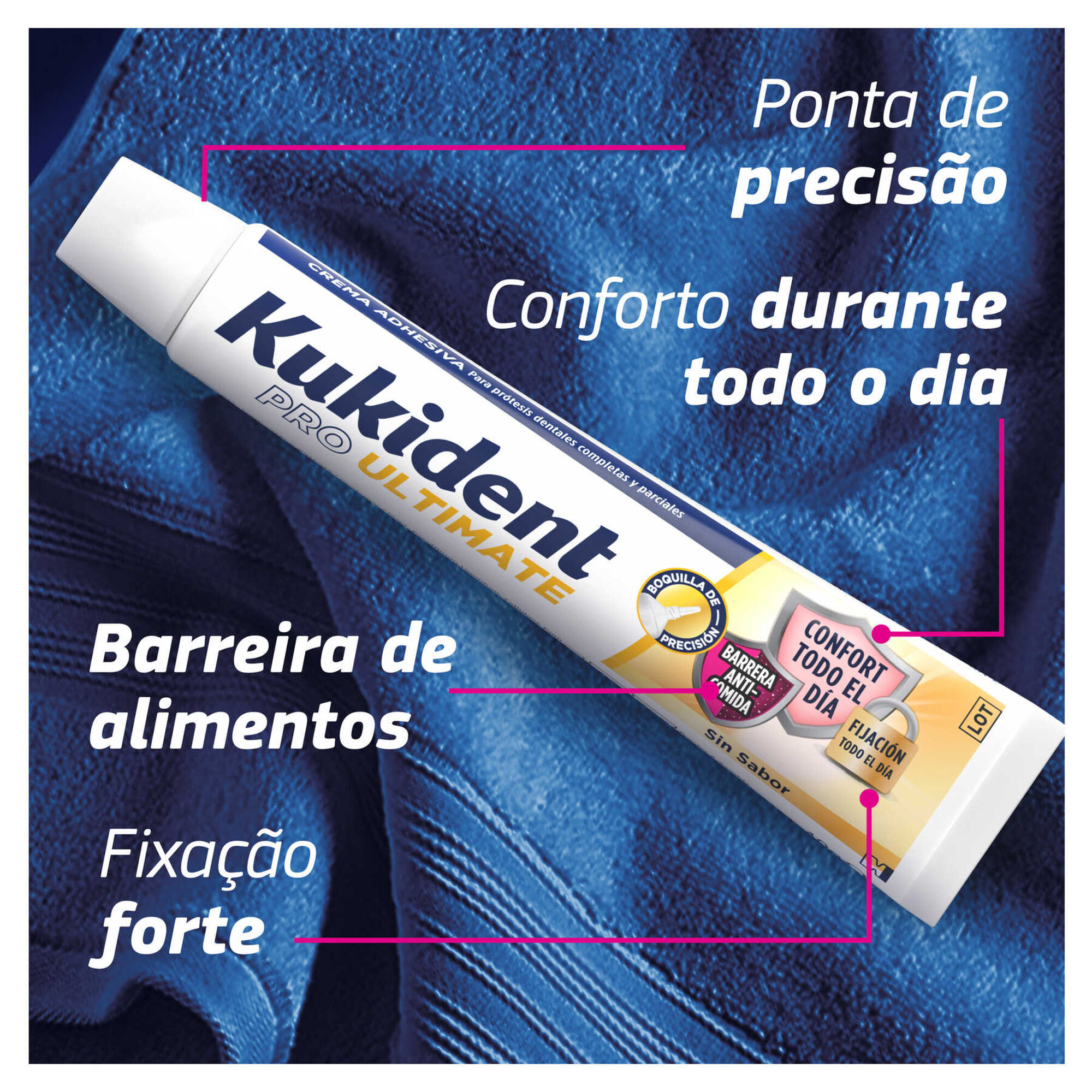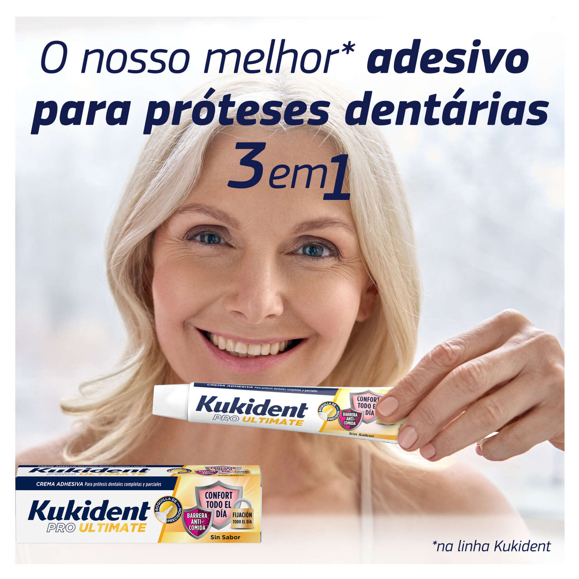 Kukident Pro oferece uma fixação imbatível, com até 88% de aderência ao final do dia, proporcionando uma fixação 10 vezes mais forte do que sem adesivo. Garante que as próteses dentárias se mantenham firmes no lugar, funcionando também como um amortecedor entre as gengivas e a prótese para um ajuste mais confortável e personalizado.