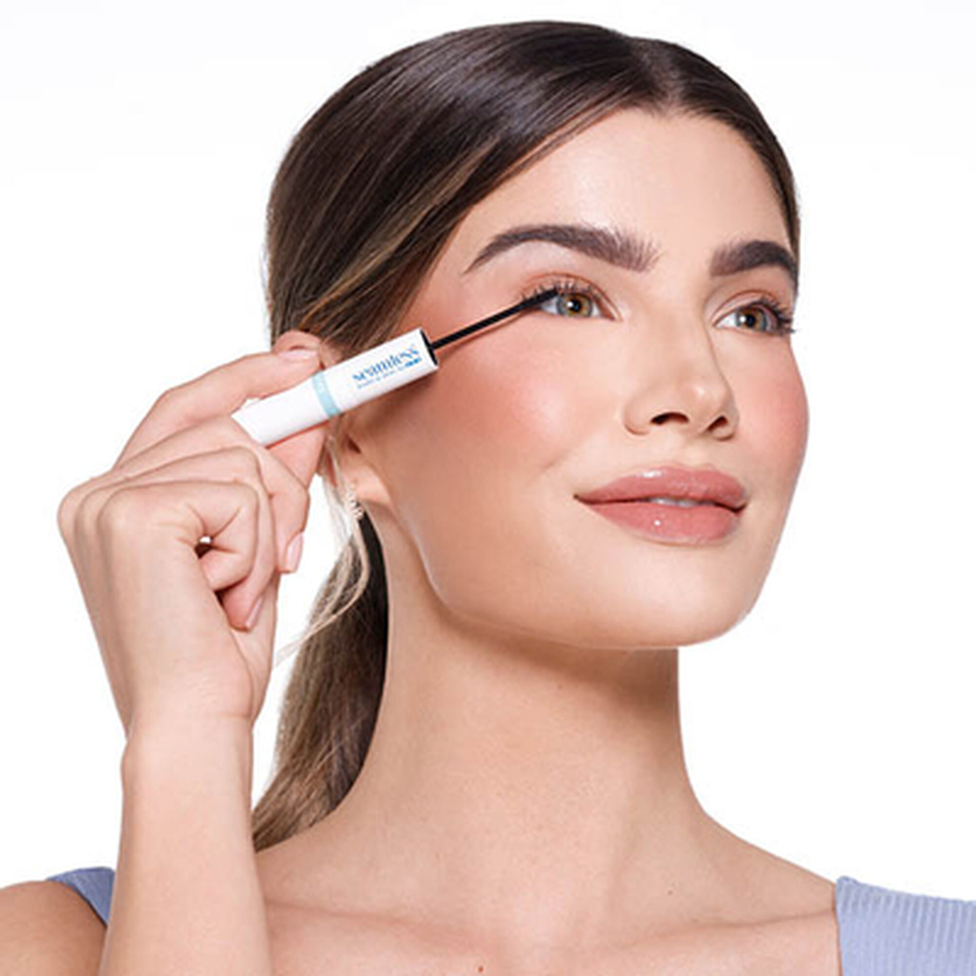 5. Aplicar o fixador e selante Seal, que também é projetado para aplicar em forma de máscara. Este produto remove o excesso de adesivo e fixa as extensões. Para remover, é muito fácil, basta aplicar o líquido Remover, em forma de rímel, sobre as extensões, e depois remover cuidadosamente com os dedos.