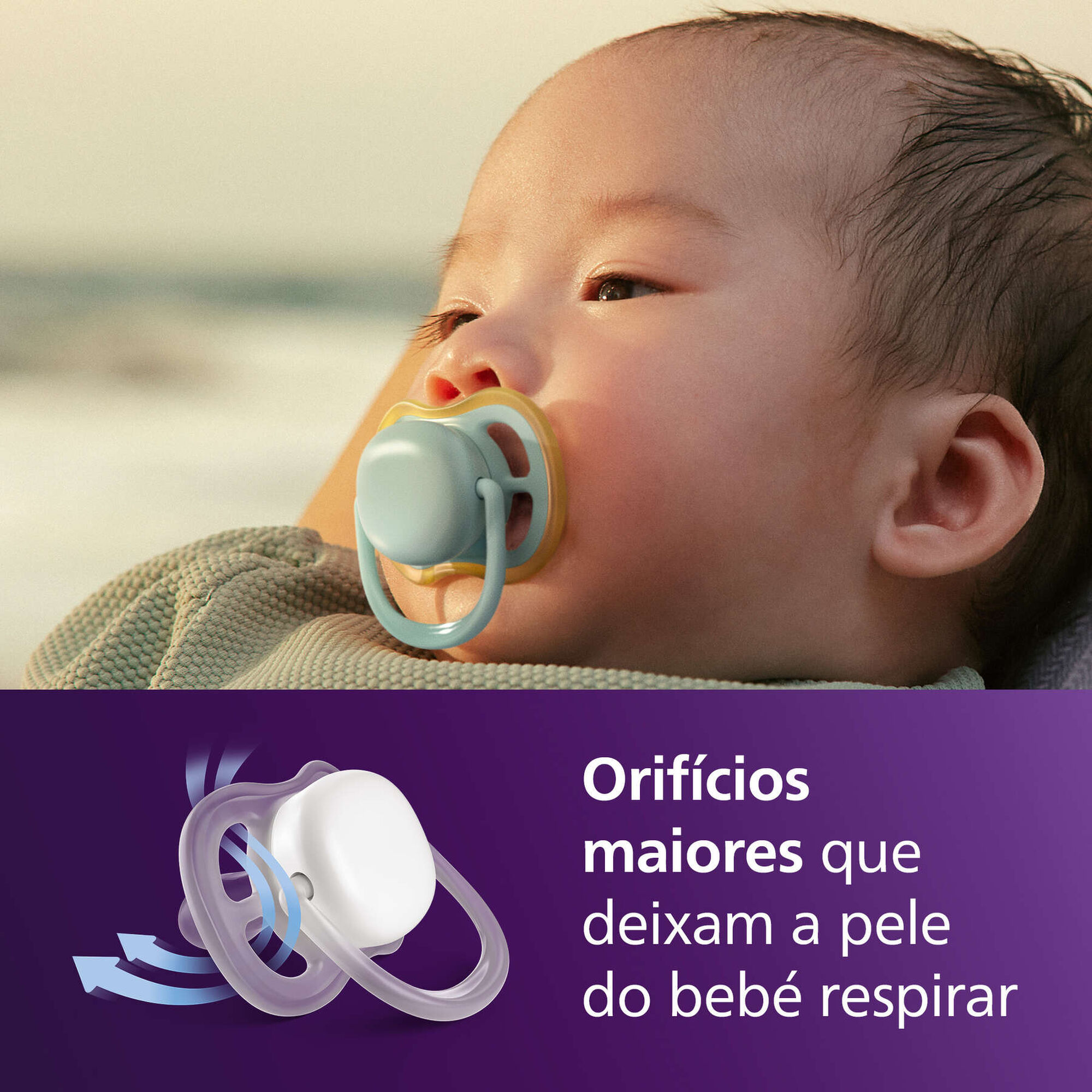 Calmante e respirável com orifícios amplos. 9 em cada 10 pais concordam: as chupetas Philips Avent Ultra Air são confortáveis para o meu bebé.