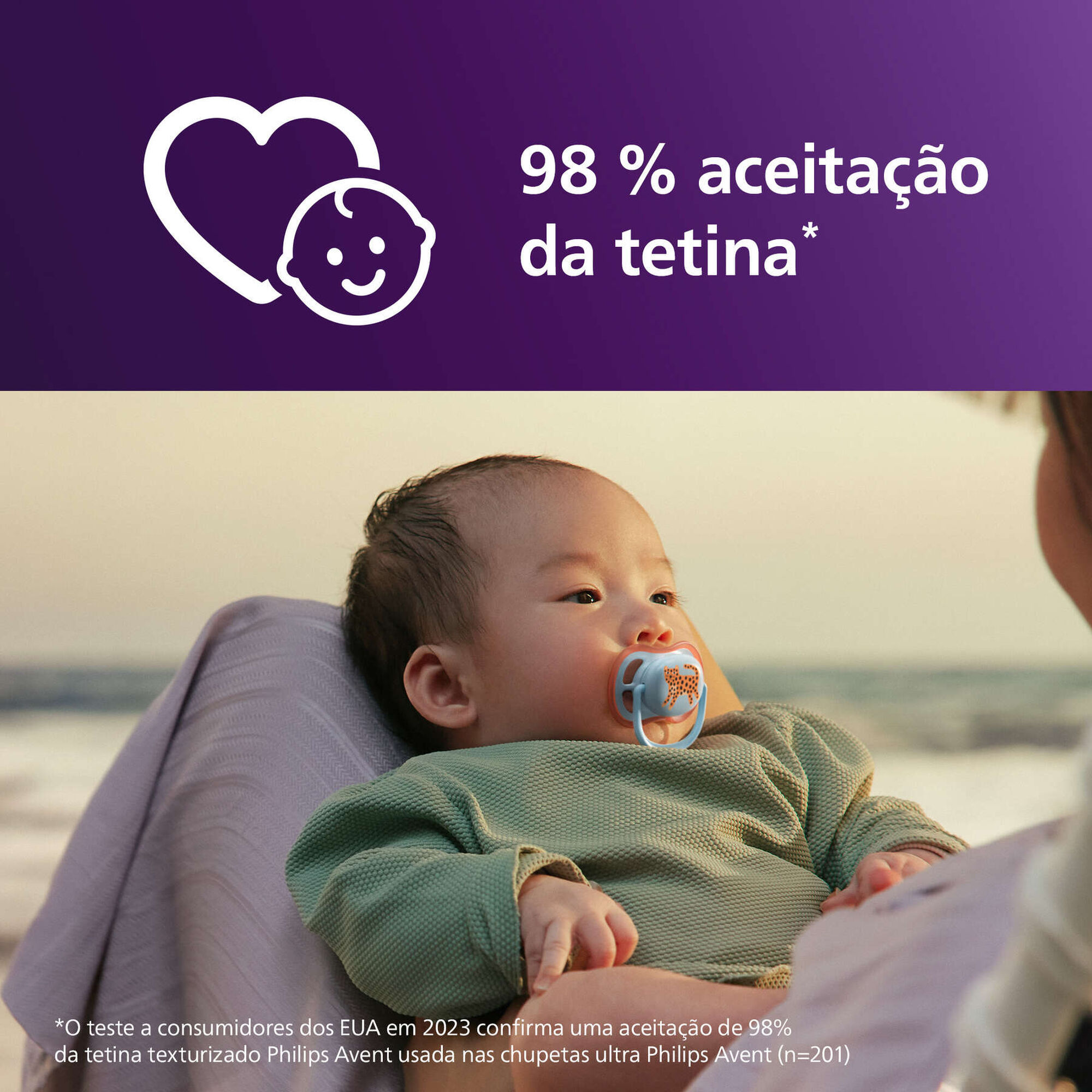 Calmante e respirável com orifícios amplos. 9 em cada 10 pais concordam: as chupetas Philips Avent Ultra Air são confortáveis para o meu bebé.