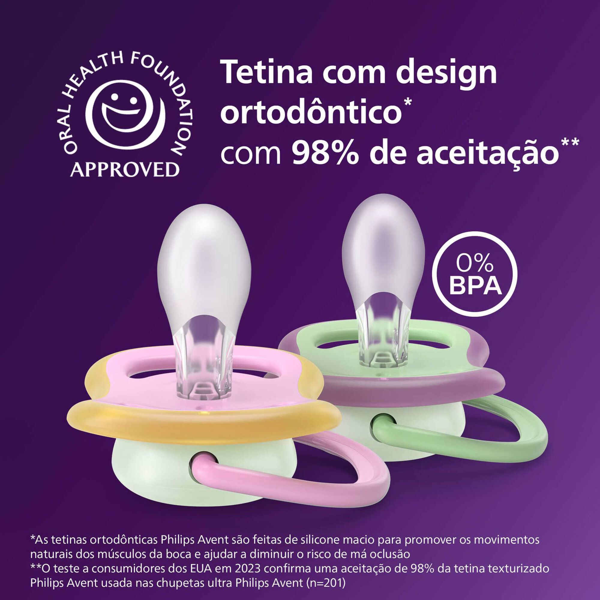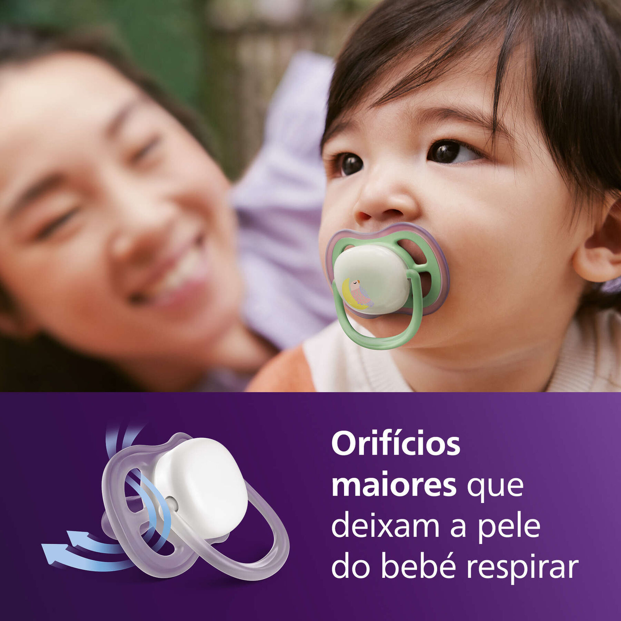 Calmante e respirável com orifícios amplos. 9 em cada 10 pais concordam: as chupetas Philips Avent Ultra Air são confortáveis para o meu bebé.
