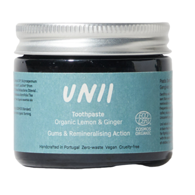 Saúde das gengivas e remineralizante. Dentífrico natural à base de bicarbonato de sódio, óleo de coco biológico e minerais, sem flúor nem glicerinas. A sua fórmula sem espuma respeita o esmalte e a flora bocal, permitindo uma remineralização dos dentes. A adição do limão e do gengibre torna-a perfeita para combater o mau hálito, inflamações frequentes e sangramento das gengivas.
