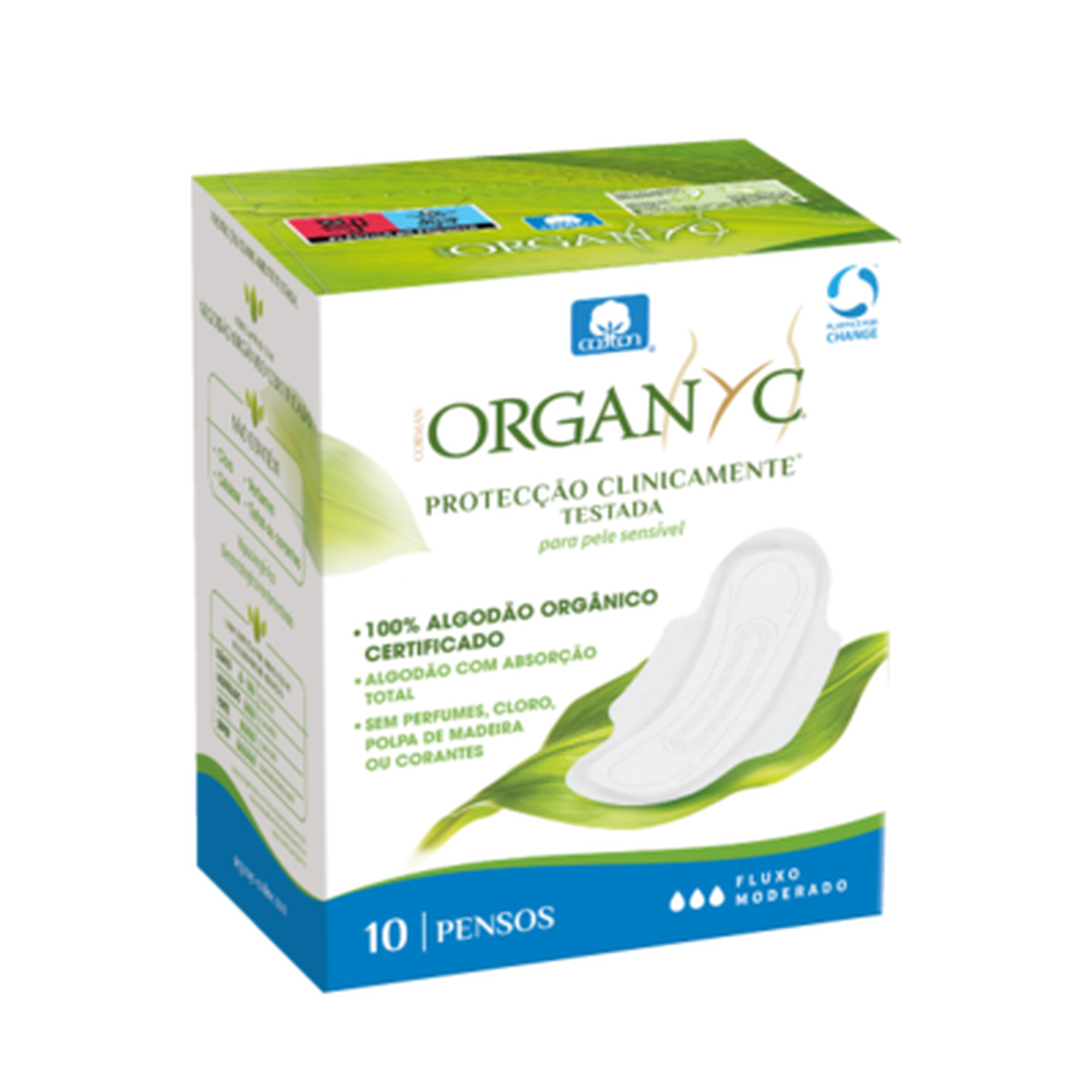 Pensos com abas, 100% algodão orgânico certificado (por dentro e por fora). Clinicamente comprovado, sem corantes, químicos, perfumes ou descolorantes.