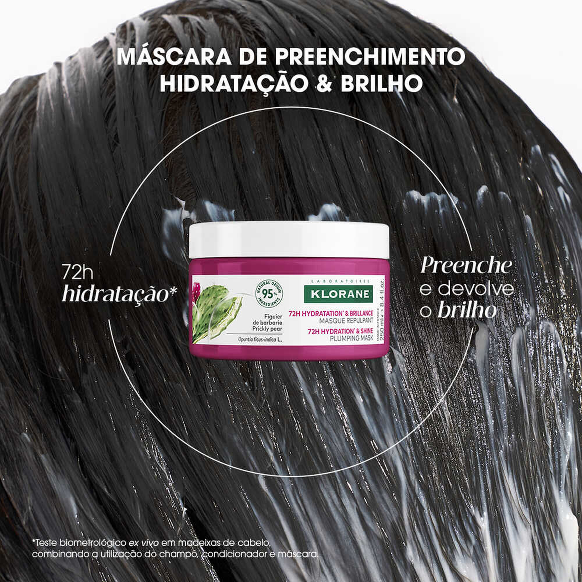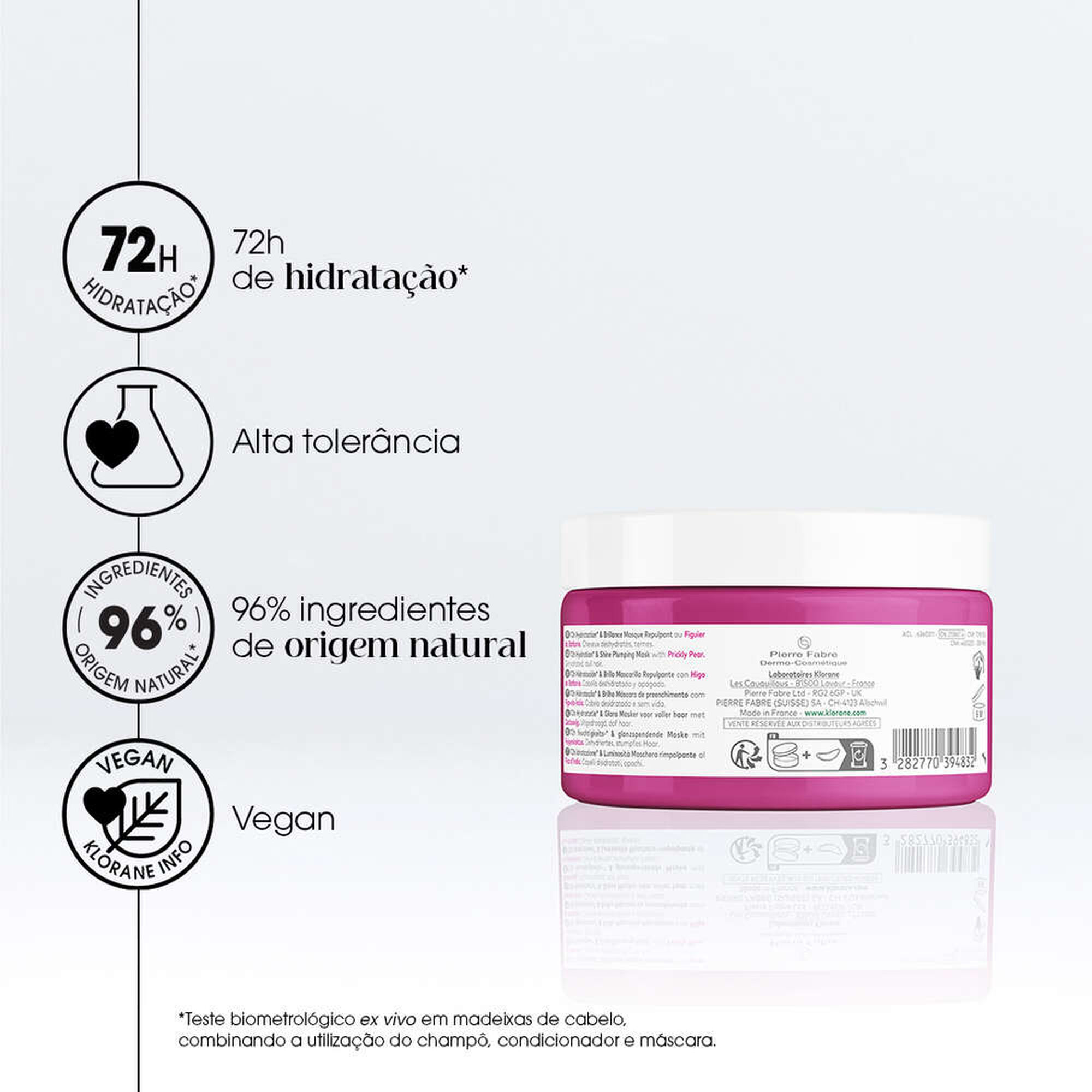 A Máscara Hidratação e Brilho Figo da Índia hidrata durante 72 horas e devolve o brilho ao cabelo desidratado e baço.