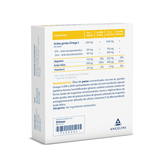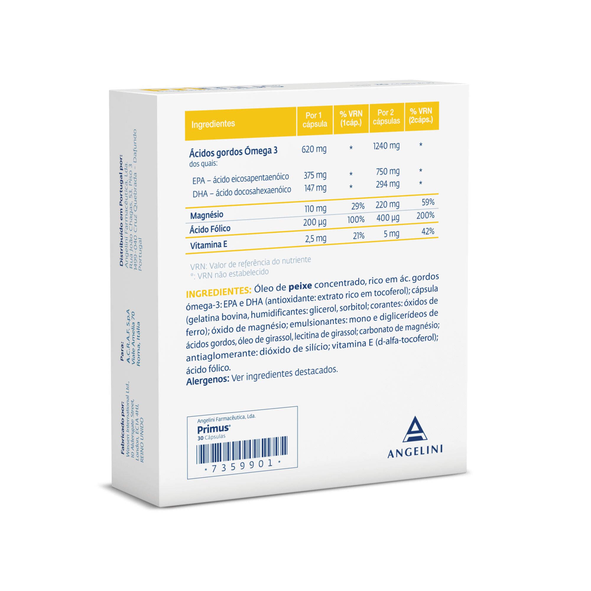 Óleo de peixe concentrado rico em ácidos gordos ómega-3: EPA e DHA (antioxidante: extrato rico em tocoferol), constituintes da cápsula [gelatina, humedificante: glicerol; corantes: (óxido de ferro vermelho, óxido de ferro amarelo)]; óxido de magnésio; Vitamina B12 (maltodextrina, cianocobalamina); emulsionante: lecitina de girassol; antiglomeante: dióxido de silício; óleo de girassol; Vitamina E (d-alfa-tocoferol); ácido fólico. Alergénio: contém peixe.