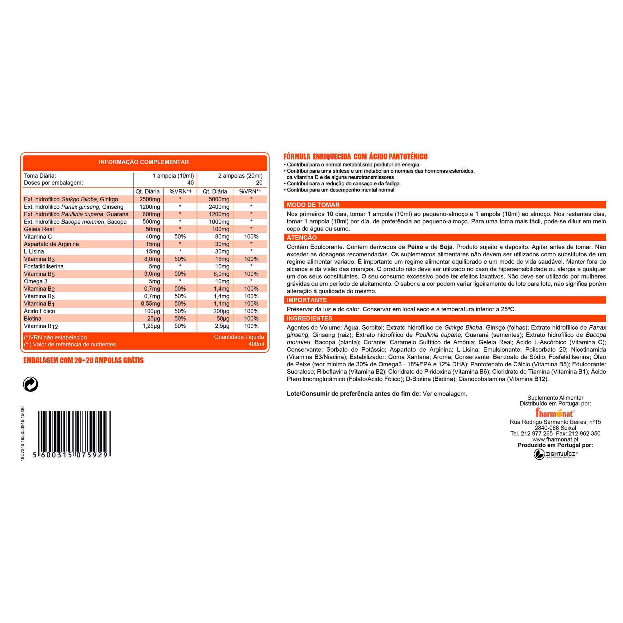 Agentes de Volume: Água, Sorbitol, Extrato hidrofílico de Panax ginseng, Ginseng (raiz), Extrato hidrofílico de Glycina hispida, Soja (sementes), Extrato hidrofílico de Ginkgo Biloba, Ginkgo (folhas), Extrato hidrofílico de Paullinia cupana, Guaraná (sementes), Extrato hidrofílico de Bacopa monnieri, Bacopa (folha), Fosfato de Sódio Anidro (Fósforo), Ácido L-Glutâmico, Extrato hidrofílico de Opuntia ficus-indica, Nopal (planta), Extrato hidrofílico de Cereais (Avena sativa, Aveia (sementes), Triticum aestivum, Trigo (sementes), Secale cereale, Centeio (sementes)), Extrato hidrofílico de Leguminosas (Vicia faba, Fava (planta), Medicago sativa, Alfafa (planta), Extrato hidrofílico de Myrcia citrifolia, Pedra Hume Caa (folha), Ácido L-Ascórbico (Vitamina C), Corante: Caramelo Sulfitico de Amónia, Extrato hidrofílico de Gonolobus condurango, Condurango (casca), L-Lisina, Conservante: Sorbato de Potássio, Pantotenato de Cálcio (Vitamina B5), Aroma, Estabilizador: Goma Xantana, Conservante: Benzoato de Sódio, Edulcorante: Glicosideos de Esteviol, Riboflavina (Vitamina B2), Cloridrato de Piridoxina (Vitamina B6), Cloridrato de Tiamina (Vitamina B1).
