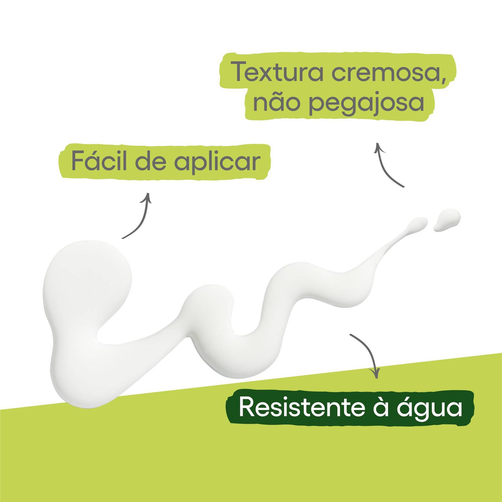 Resistente à água. Sem perfume. Sem álcool. Sem cinamatos. Sem octocrileno. Sem fenoxietanol.