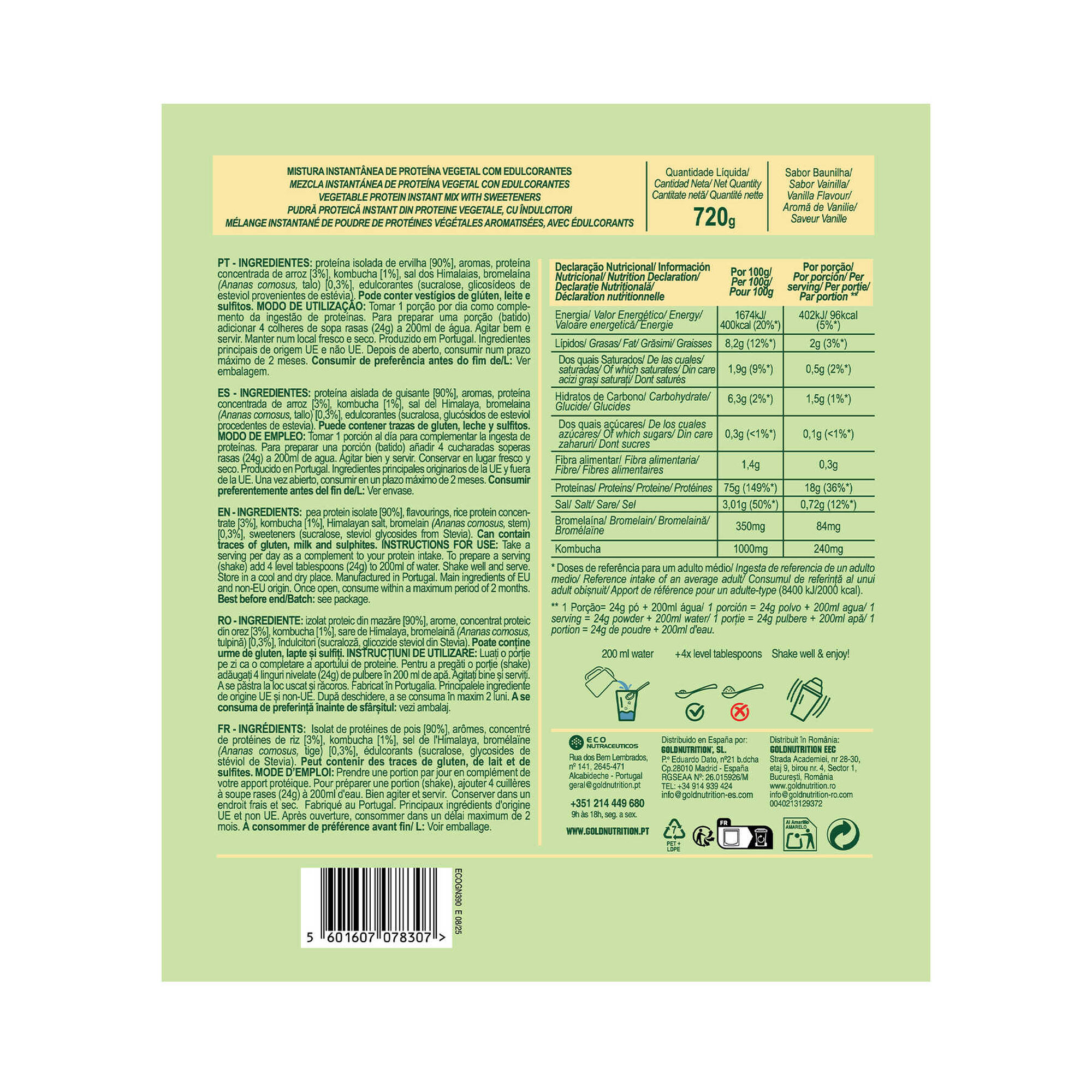 A Proteína em Pó Vegan Sabor a Baunilha é um produto rico em proteínas vegetais (72-78%) proveniente da ervilha e do arroz, o que permite que a sua composição inclua todos os aminoácidos essenciais para o organismo, sem adição de açúcares, contém menos de 1 g de açúcar por batido.