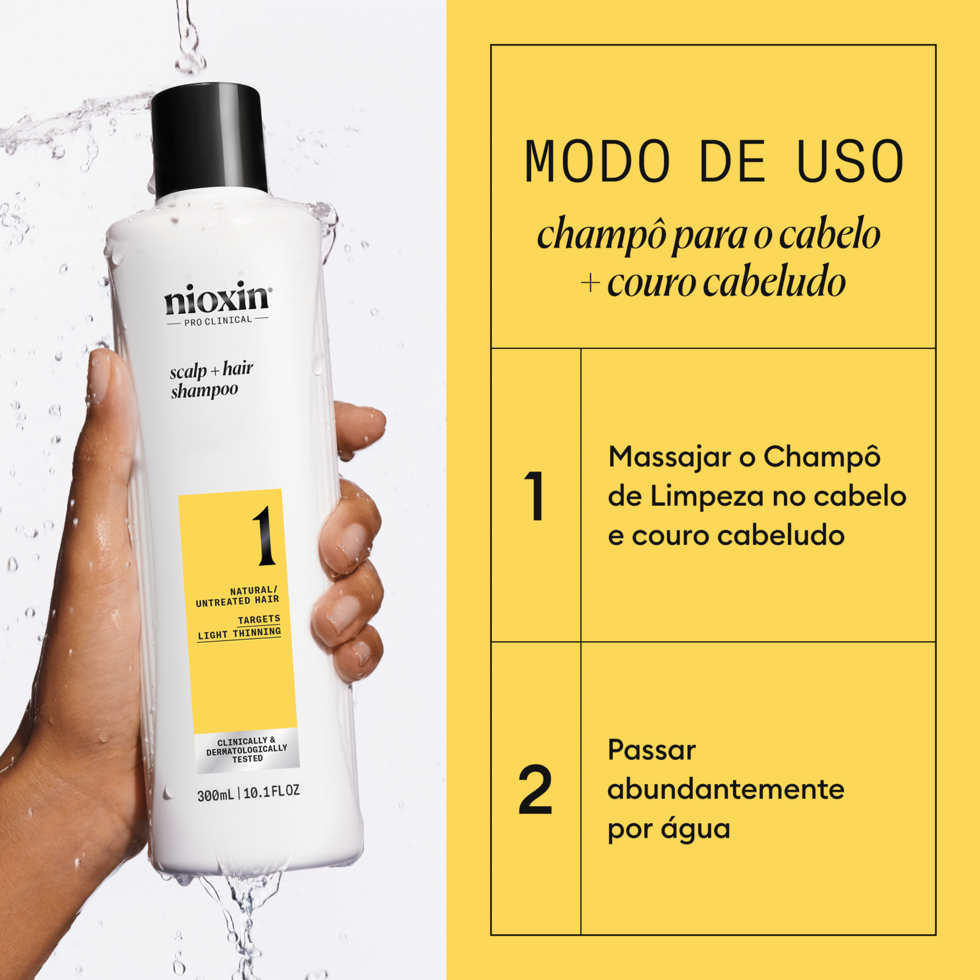 Somos Nioxin, a marca profissional nº 1 em cuidados capilares para um cabelo mais forte e com mais volume. O Kit do Sistema 1 da Nioxin Professionals é um conjunto de 3 passos projetado para o cabelo natural e sem tratamento com enfraquecimento leve. Este champô foi testado clínica e dermatologicamente, nutrindo e limpando cuidadosamente o cabelo para evitar que o sebo obstrua os folículos, resultando em um cabelo mais espesso e volumoso.