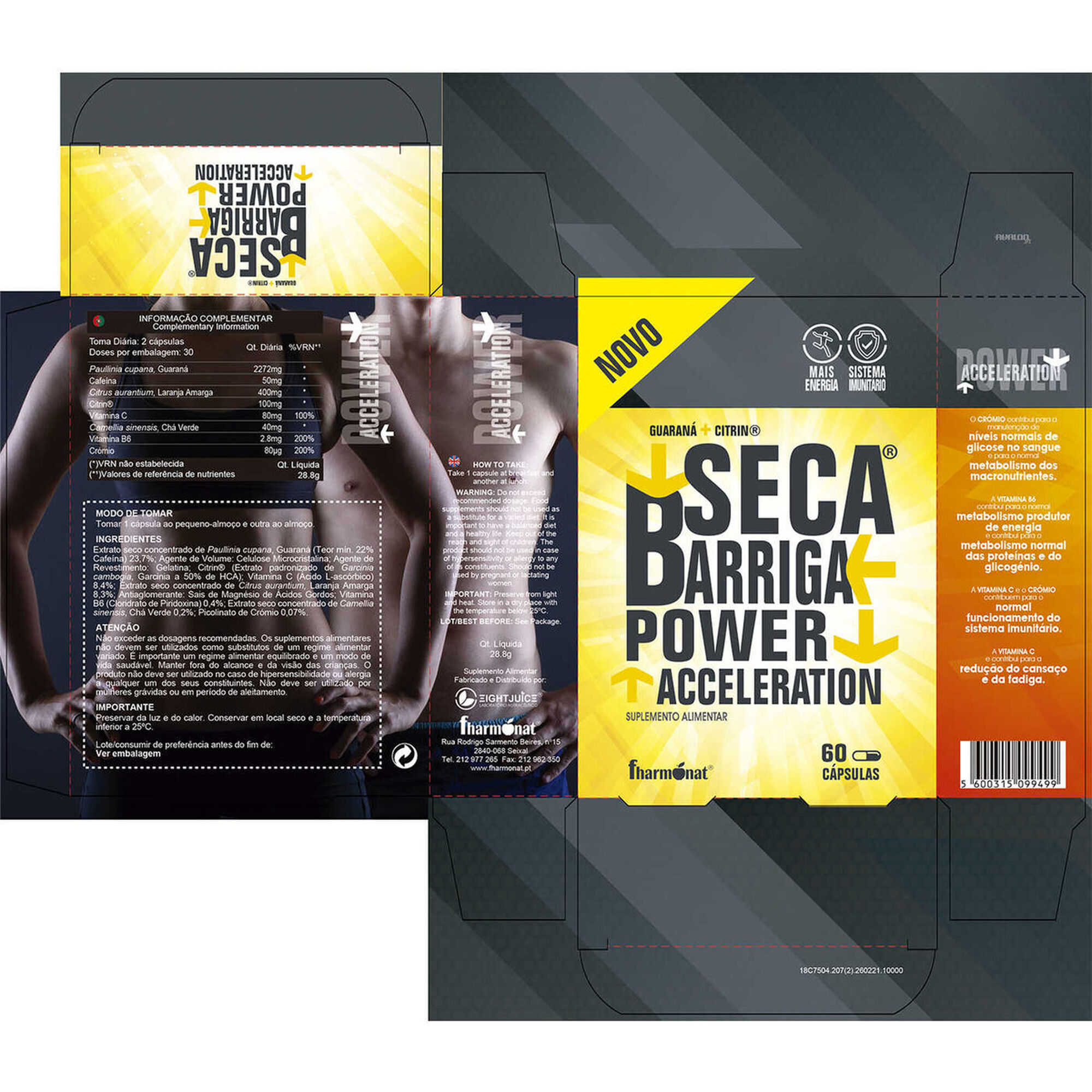 Lista completa: Extrato seco concentrado de Paullinia cupana, Guaraná ( Teor Mmín. 22% Cafeína) 23%; Agente de Colume: Celulose Microcristalina; Agente de Revestimento: Gelatina; Citrin® ( Extrato padronizado de Garcinia Cambogia, Garcinia a 50% de HCA); Vitamina C ( Ácido L-Ascórbico) 8,4%; Extrato seco concentrado de Citrus aurantium, Laranja Amarga 8,3%; Antiaglomerante: Sais de Magnésio de Ácidos Gordos; Vitamina B6(Cloridrato de Piridoxina) 0,4%; Extrato seco concentrado de Camellia sinensis, Chá Verde 0,2%; Picolinato de Crómio 0,07%.