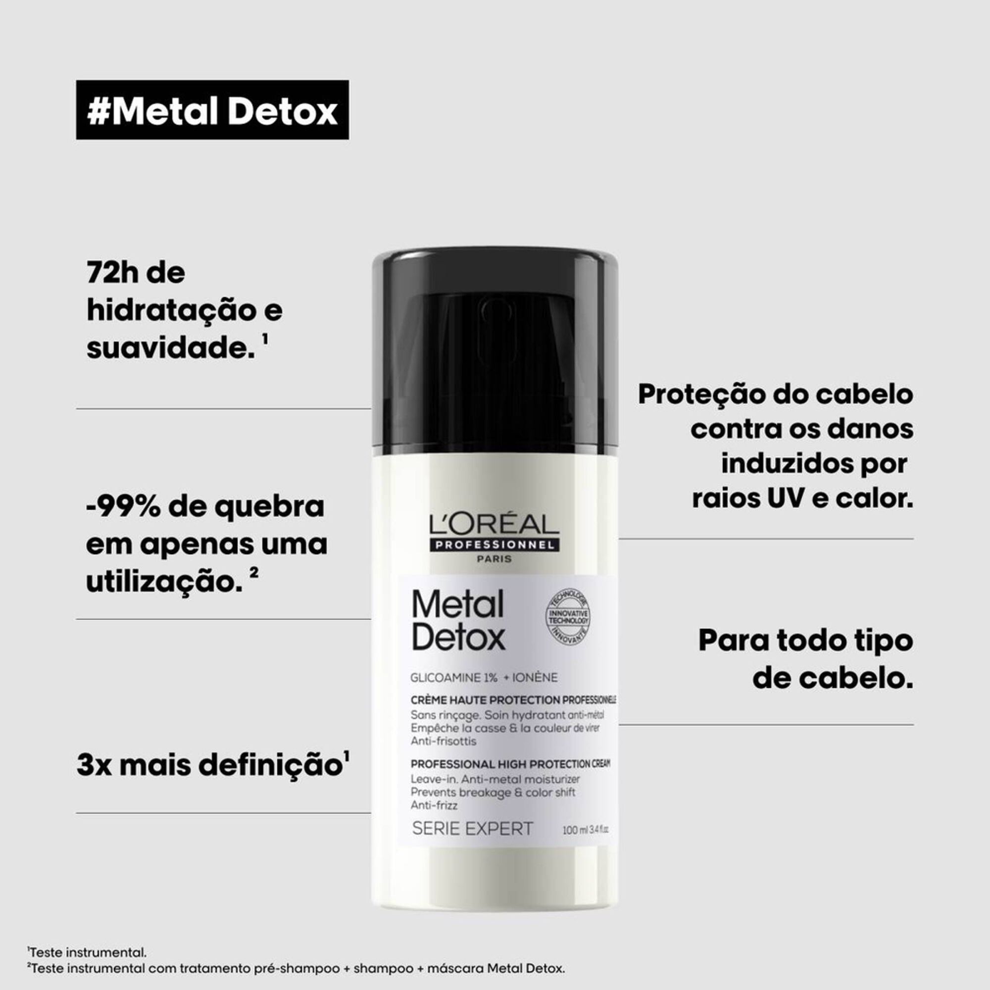 O Creme Termo-Protetor Anti-frizz Metal Detox protege o cabelo contra os danos induzidos pelos raios UV, a oxidação, brushing e calor até 230°C.