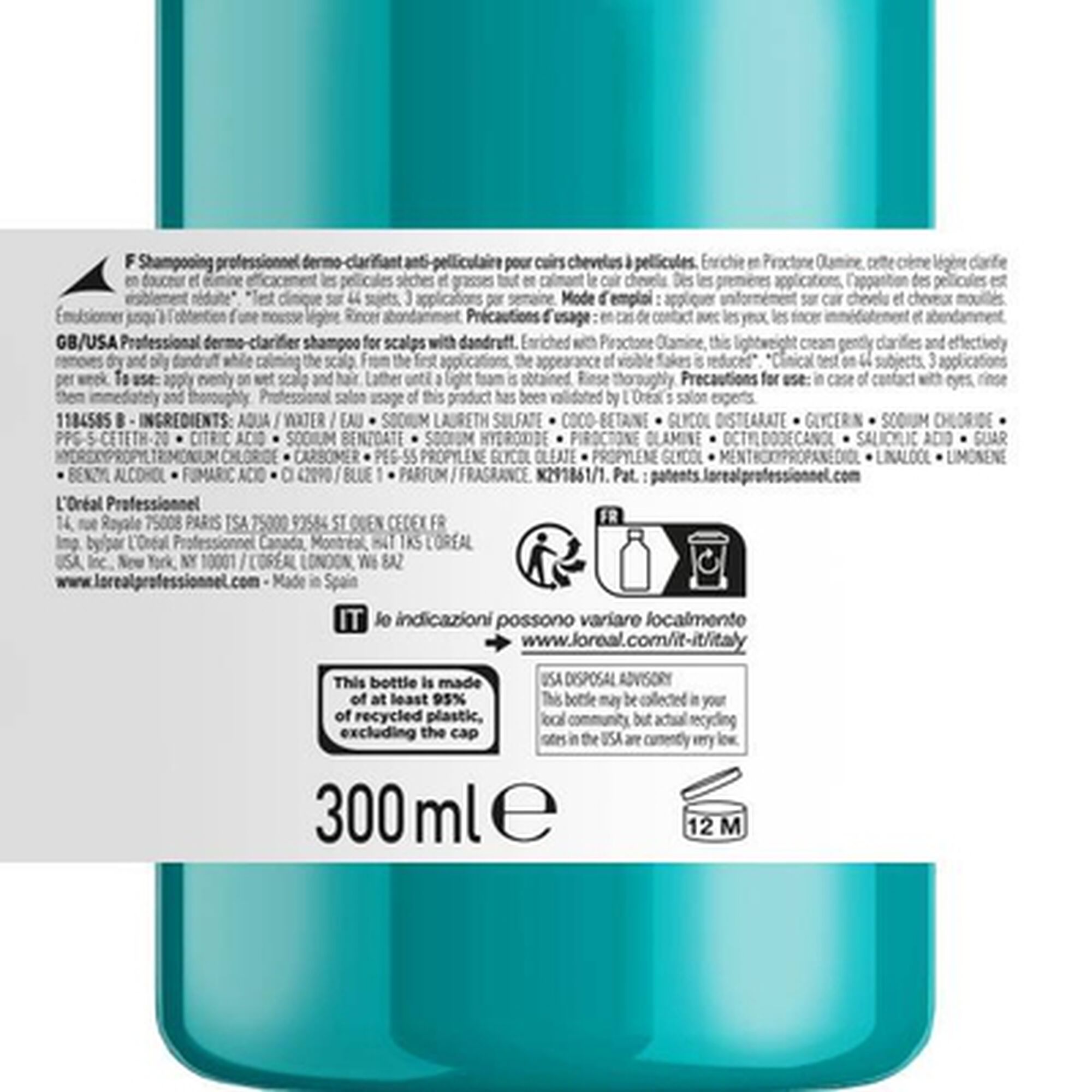 Aqua / Water / Eau , Sodium Laureth Sulfate , Coco-Betaine ,Glycol Distearate ,Glycerin , Sodium Chloride, Ppg-5-Ceteth-20, Citric Acid , Sodium Benzoate , Sodium Hydroxide • Piroctone Olamine , Octyldodecanol , Salicylic Acid , Guar Hydroxypropyltrimonium Chloride , Carbomer ,Peg-55 Propylene Glycol Oleate , Propylene Glycol , Menthoxypropanediol • Linalool , Limonene ,Benzyl Alcohol , Fumaric Acid , Parfum / Fragrance.