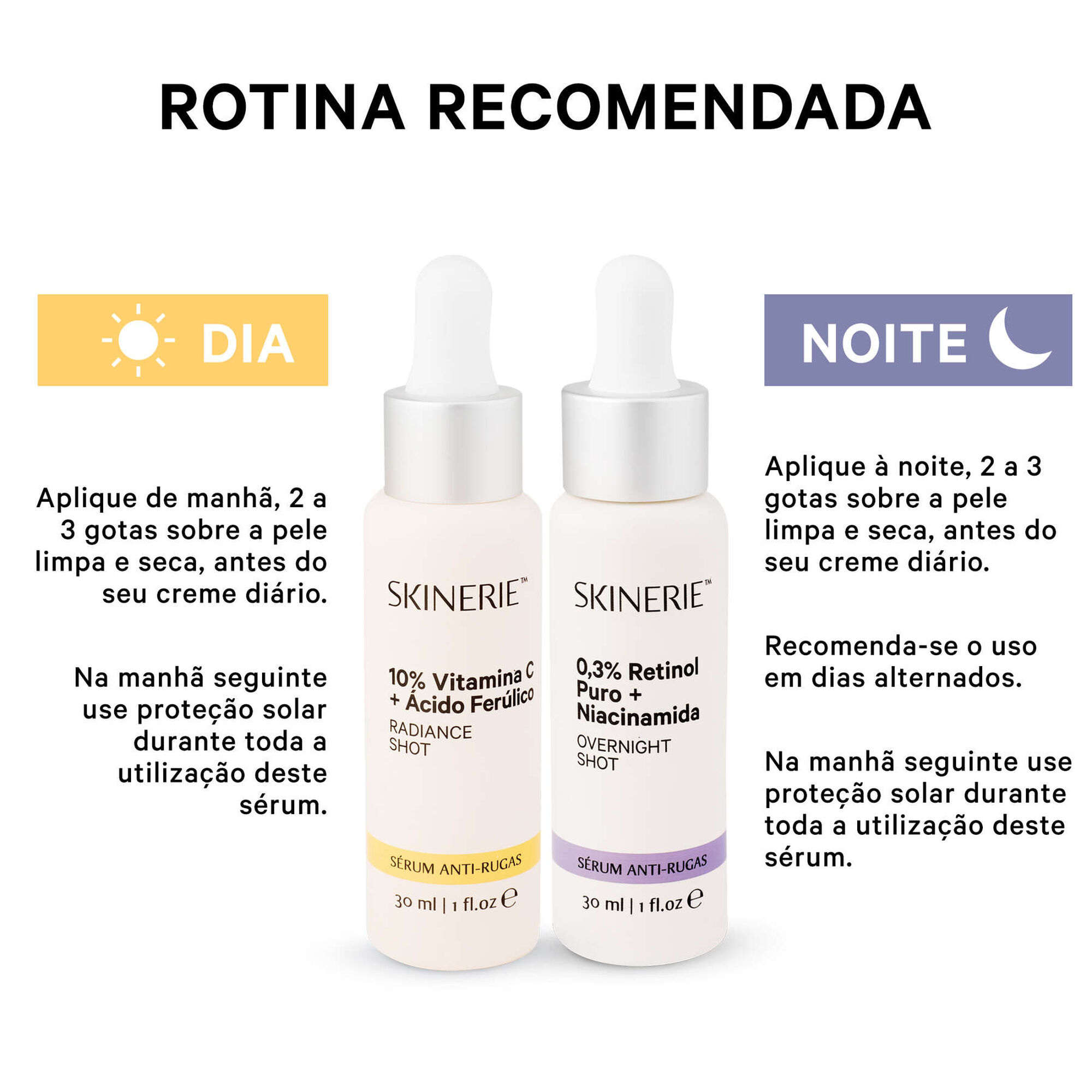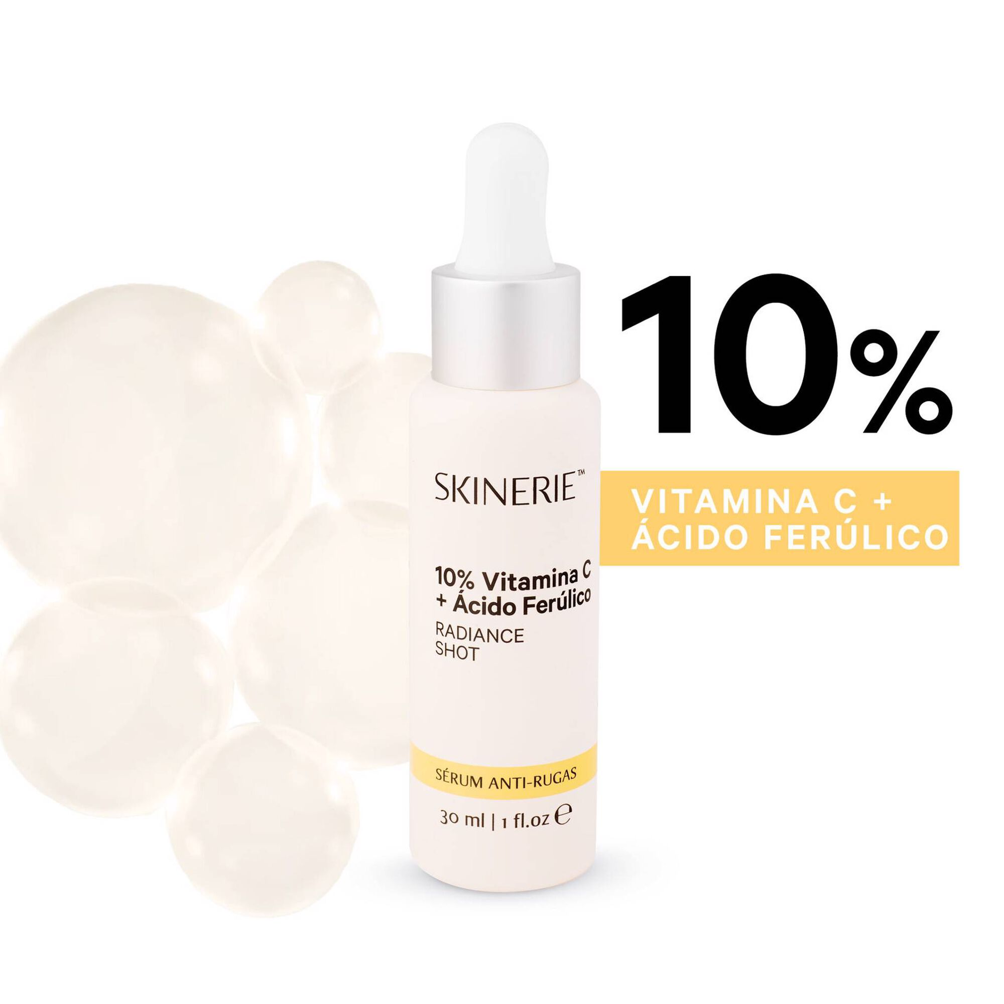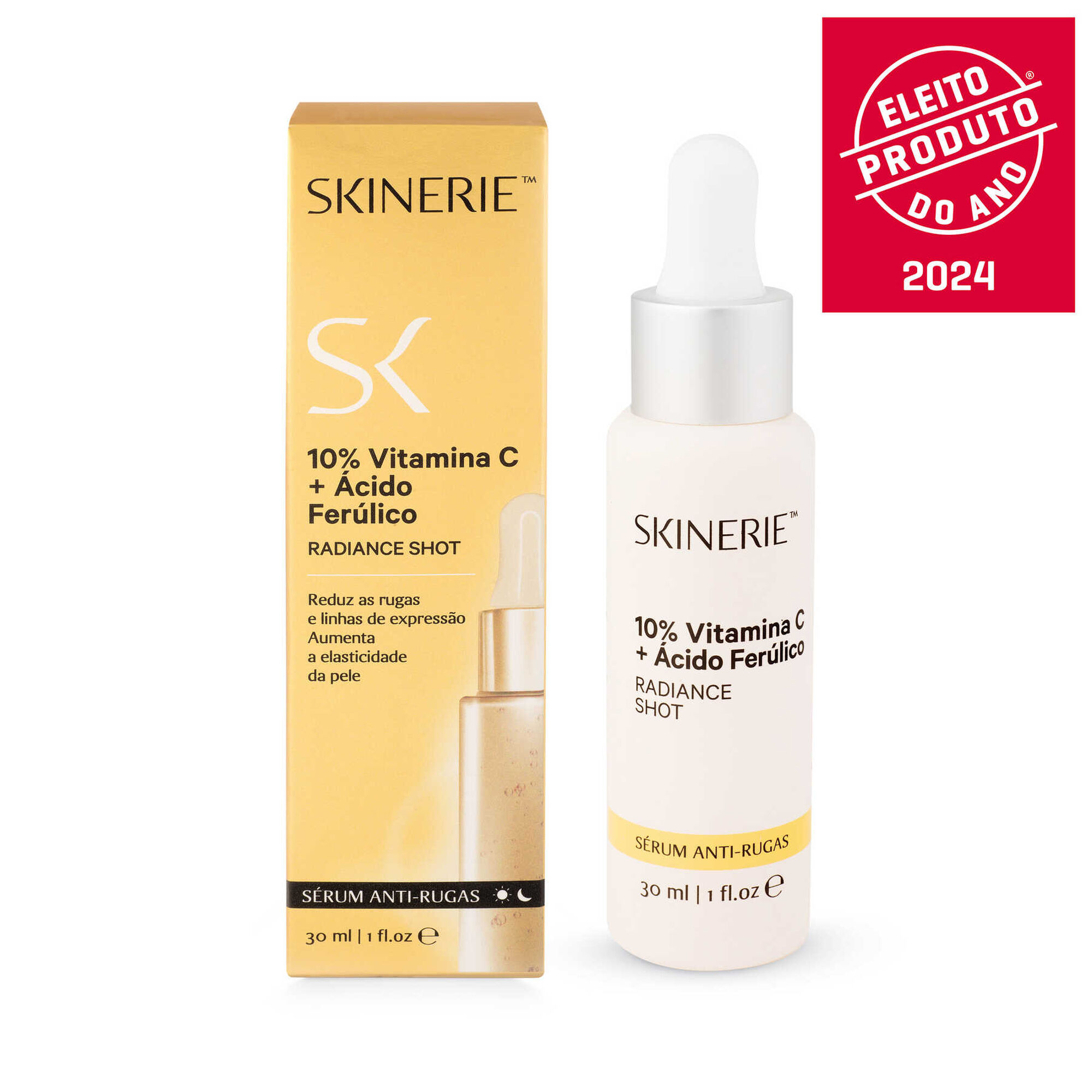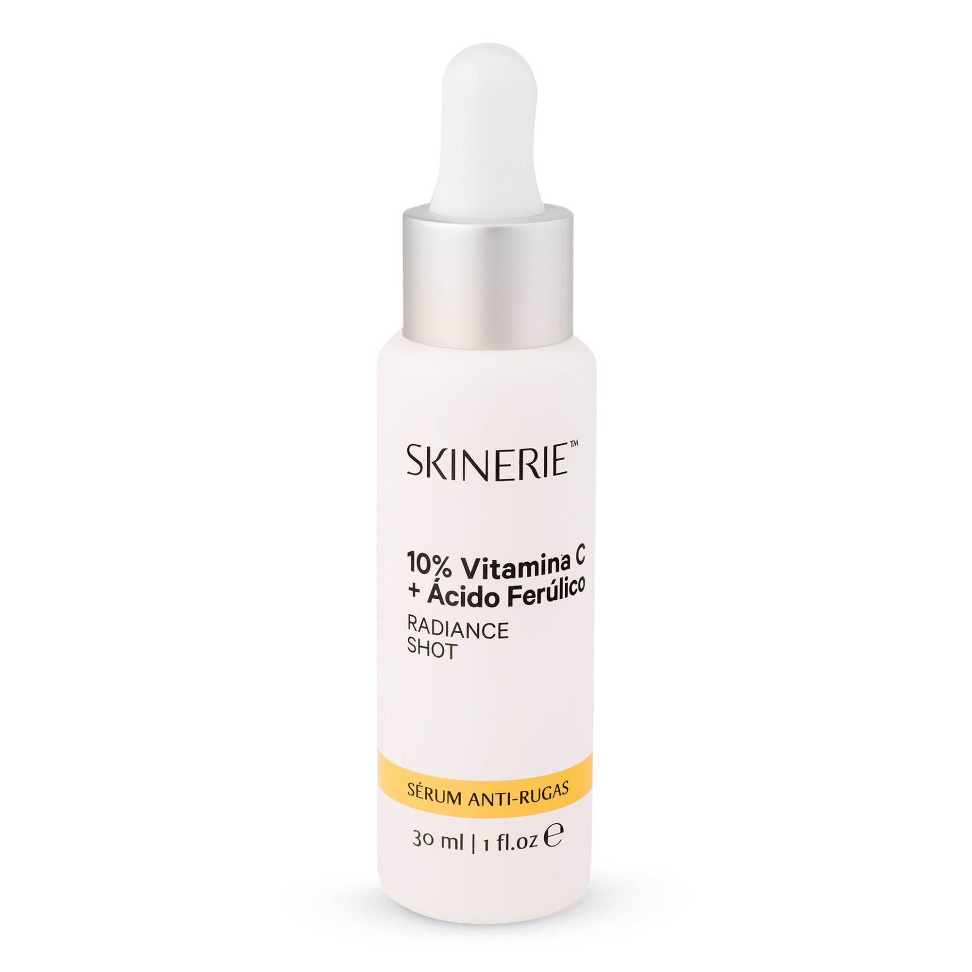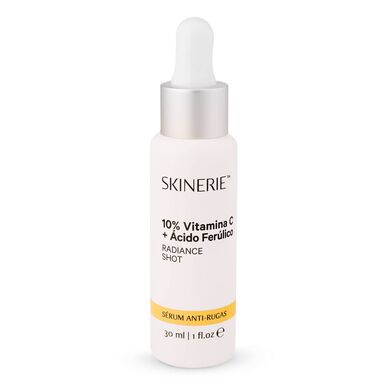 O Sérum Radiance Shot com 10% de Vitamina C e com Ácido Ferúlico é um cuidado de rosto especialmente desenvolvido para te proporcionar uma pele jovem e luminosa. A sua fórmula reduz as rugas e linhas de expressão, aumenta a elasticidade da pele, melhora a sua luminosidade e a textura, unificando o tom da pele, e assegura a sua hidratação.