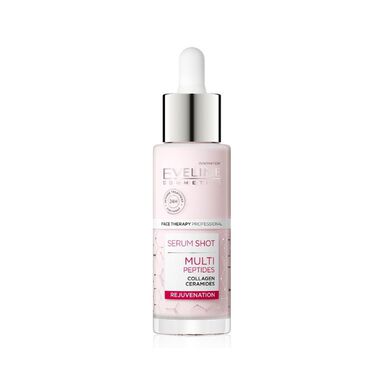 O sérum Shot com multi-Peptideos de cuidado para o rosto da marca Eveline possui uma ação de rejuvenescimento especialmente desenvolvido para peles maduras com sintomas visíveis de envelhecimento, como a perda de densidade e elasticidade, rugas e linhas finas.