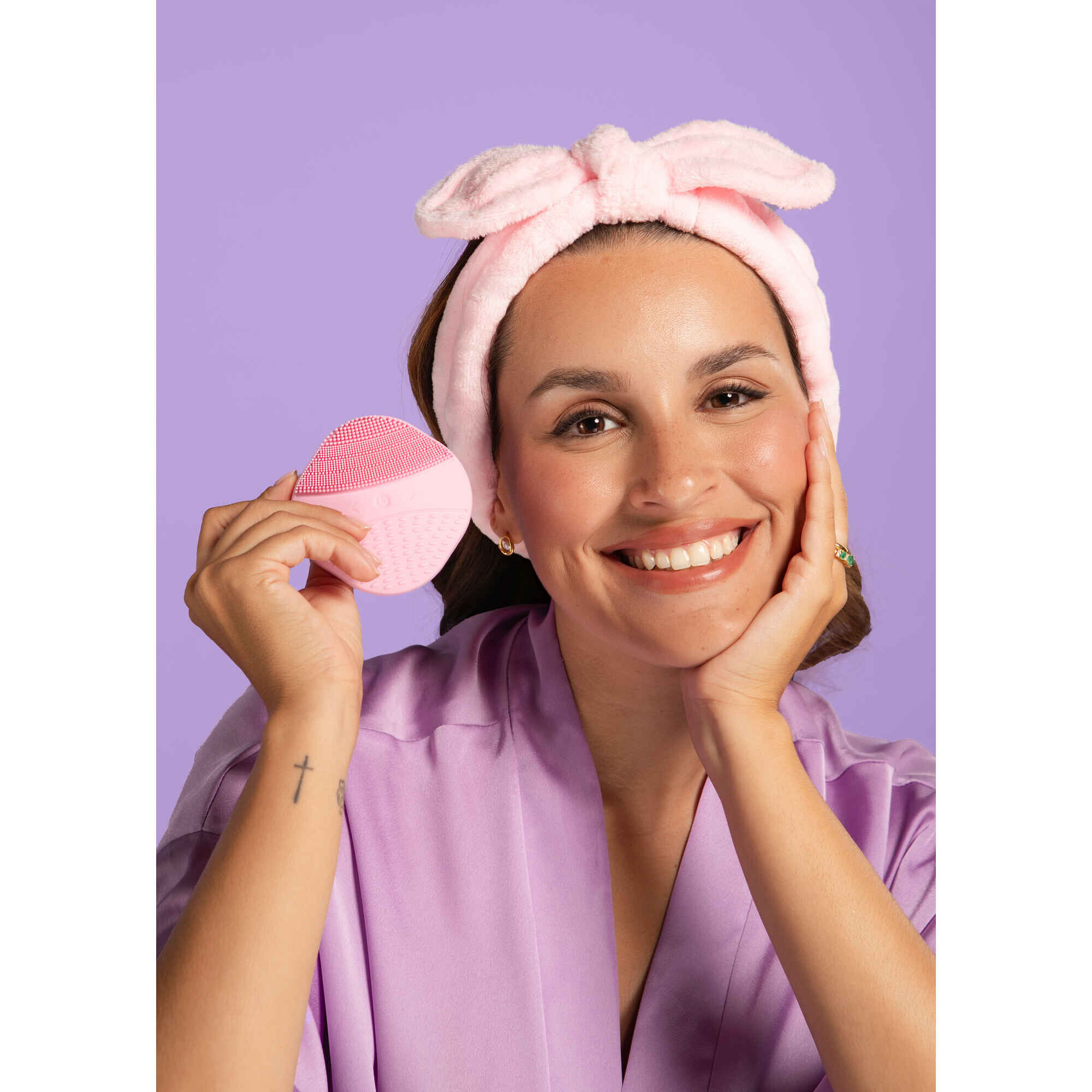 A fita mantém o cabelo no lugar enquanto o dispositivo facial limpa em profundidade e deixa a pele pronta para brilhar. Ideal para quem adora cuidar-se sem complicações — prática, fofa e com aquela vibe de “estou a cuidar de mim porque mereço”.