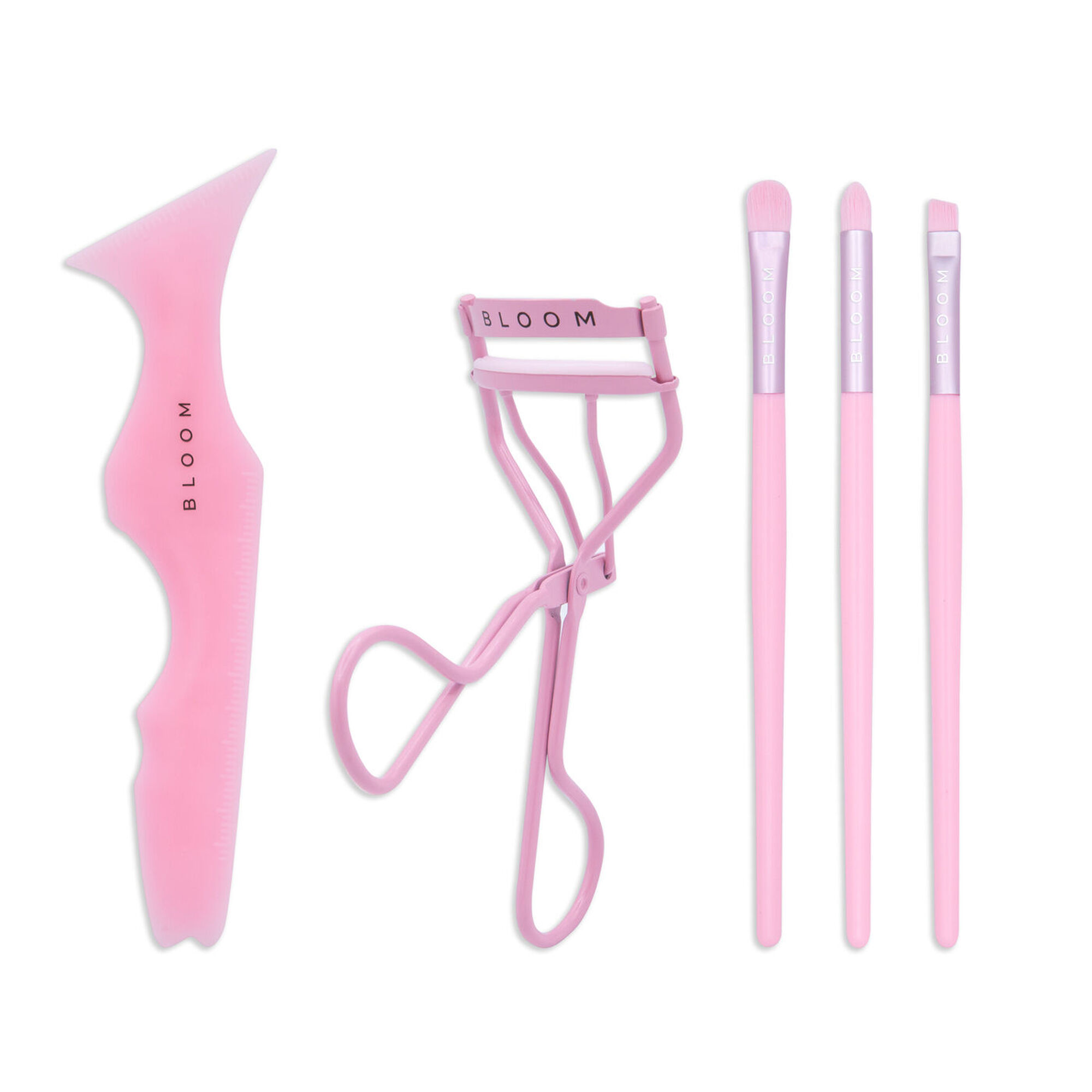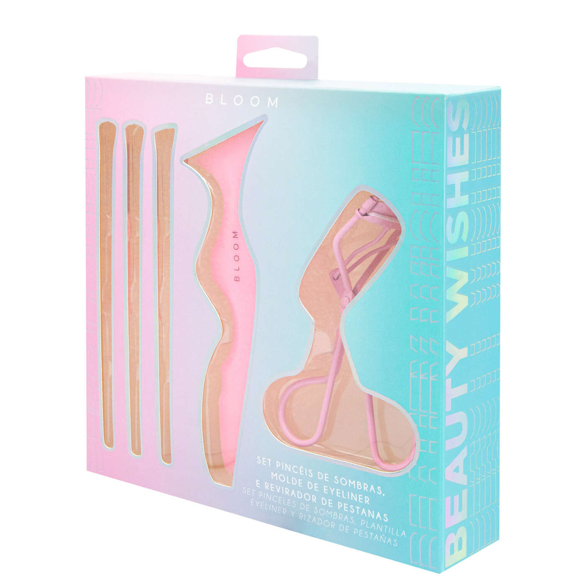 Este conjunto inclui vários produtos para um olhar perfeito: 3 pincéis de sombras de olhos, um molde para fazeres o teu eyeliner e um revirador de pestanas.