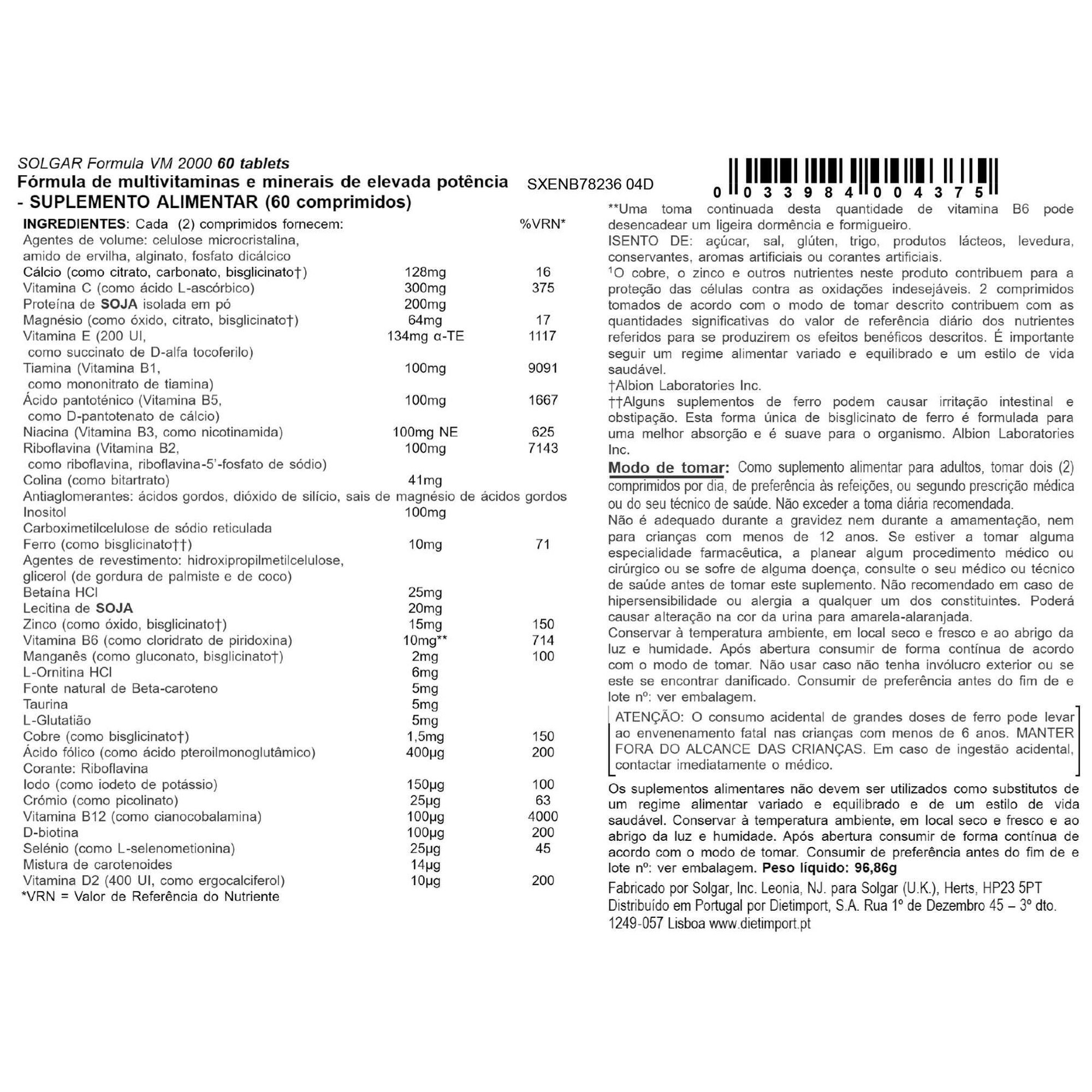 Solgar VM-2000 é um Suplemento alimentar constituido por um conjunto de aminoácidos, vitaminas e minerais que funcionam sinergicamente.