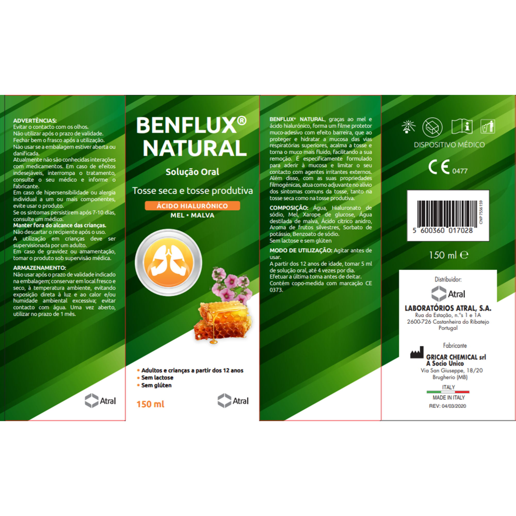 Benflux Natural Solução Oral com ácido hialurónico, mel e água de malva, acalma a tosse e torna o muco mais fluído.