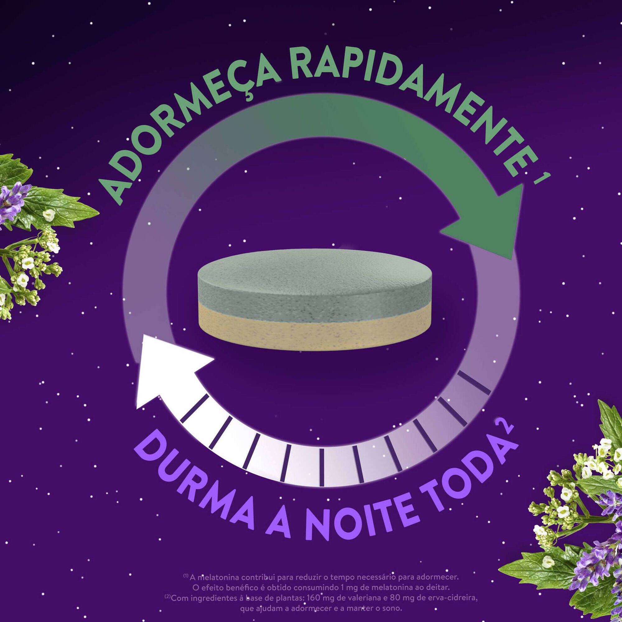 ¹A melatonina contribui para reduzir o tempo necessário para adormecer. O efeito benéfico é obtido consumindo 1 mg de melatonina ao deitar. ²Com ingredientes à base de plantas: 160 mg de valeriana e 80 mg de erva-cidreira, que ajudam a adormecer e a manter o sono. ³A Vitamina B6 contribui para a redução do cansaço e da fadiga.