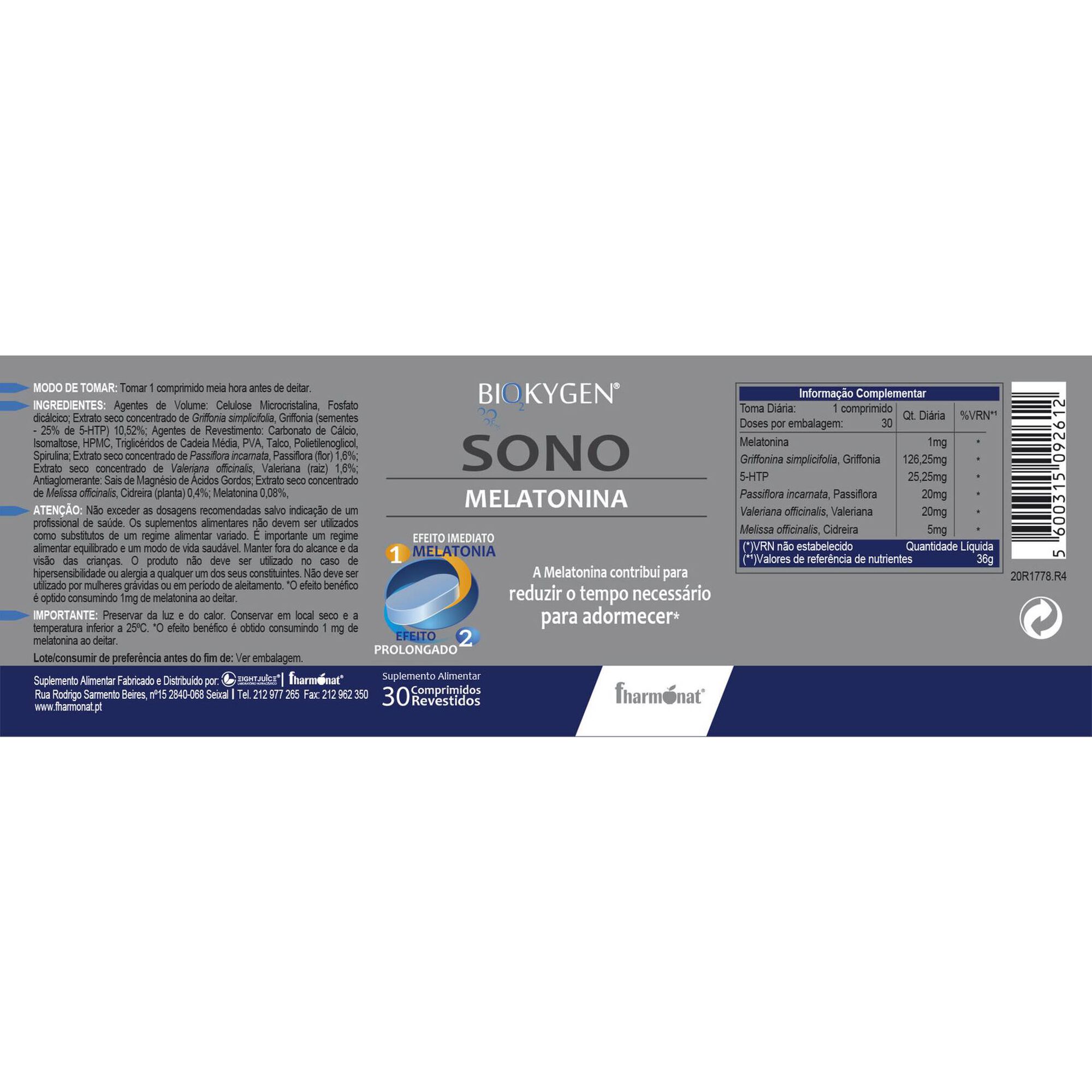 Agentes de Volume: Celulose Microcristalina, Fosfato dicálcico; Extrato seco concentrado de Griffonia simplicifolia, Griffonia (sementes - 25% de 5-HTP) 10,52%; Agentes de Revestimento: Carbonato de Cálcio, Isomaltose, HPMC, Triglicéridos de Cadeia Média, PVA, Talco, Polietilenoglicol, Spirulina; Extrato seco concentrado de Passiflora incarnata, Passiflora (flor) 1,6%; Extrato seco concentrado de Valeriana officinalis, Valeriana (raiz) 1,6%; Antiaglomerante: Sais de Magnésio de Ácidos Gordos; Extrato seco concentrado de Melissa officinalis, Cidreira (planta) 0,4%; Melatonina 0,08%.