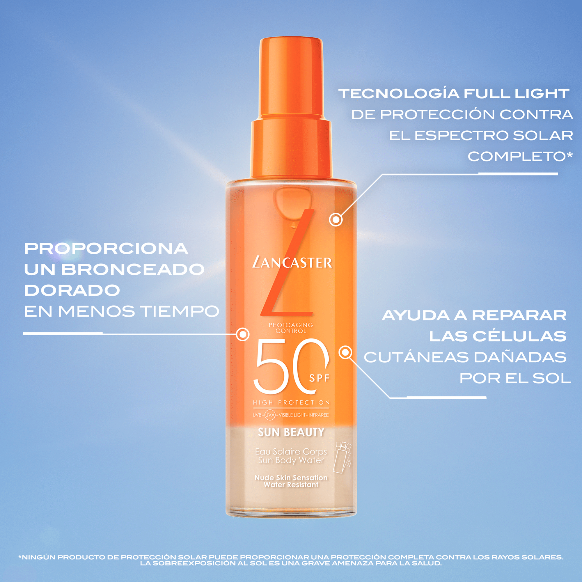Proteja a sua pele mais além dos cuidados tradicionais contra os raios UV com Sun Beauty Sun Body Water SPF50 da Lancaster, a marca de cuidados solares de prestígio n.º 1 na Europa1.