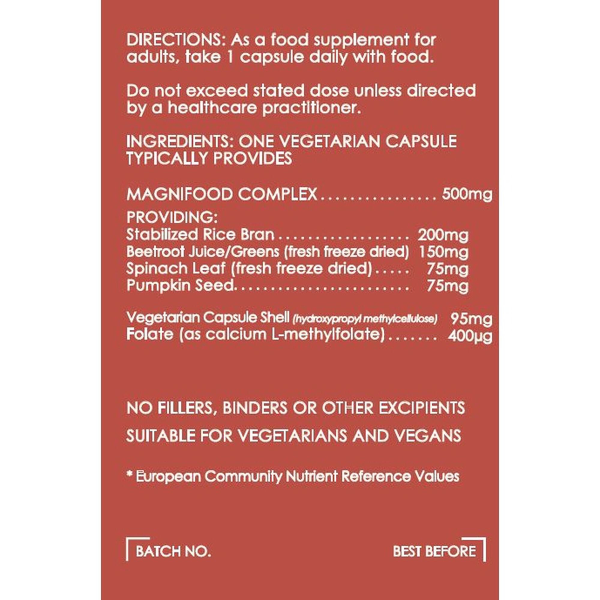 Fornece 400μg por cápsula, que contribui para o crescimento do tecido materno durante a gravidez, contribui para a síntese normal dos aminoácidos, contribui para a normal formação do sangue, contribui para o normal metabolismo da homocisteína, contribui para uma normal função psicológica, contribui para o normal funcionamento do sistema imunitário, contribui para a diminuição do cansaço e da fadiga e tem um papel no processo de divisão celular.