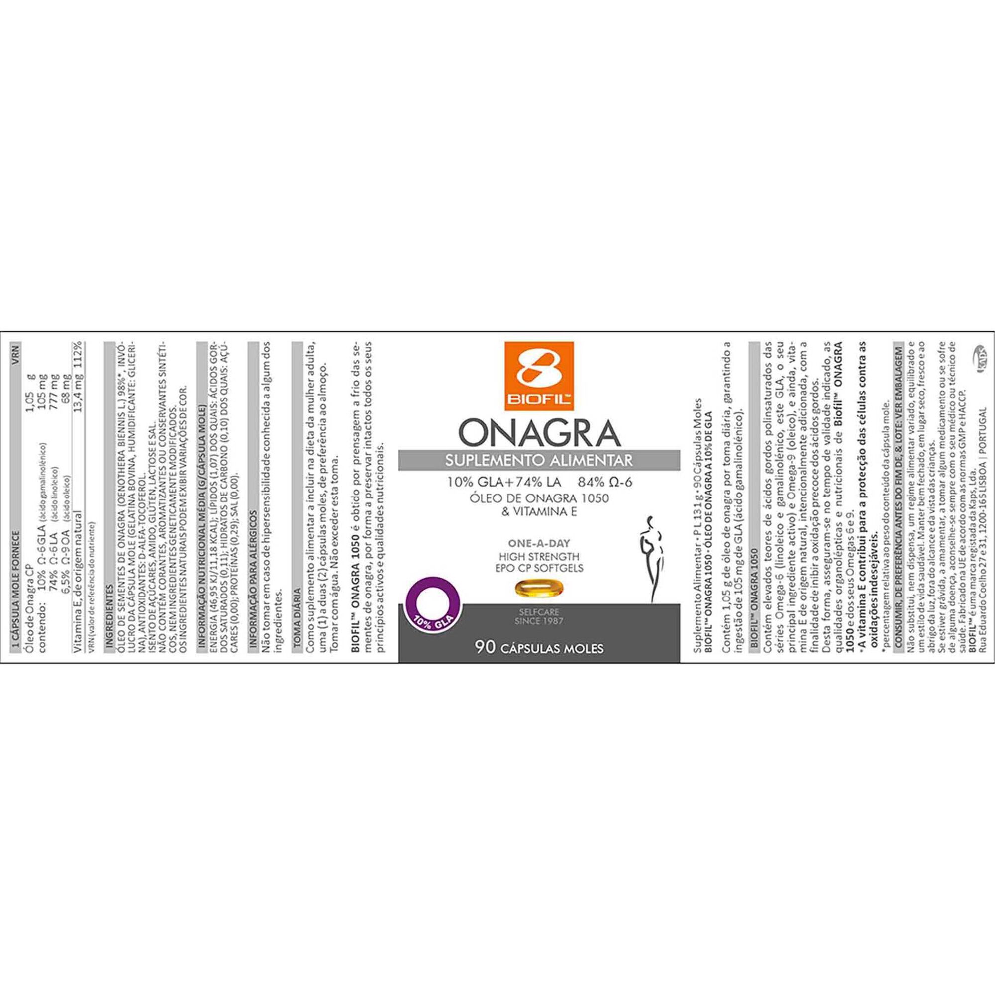 Biofil Onagra 1050 10% GLA contém 1,05 g de óleo de sementes de Onagra/ cápsula mole, com elevados teores de ácidos gordos polinsaturados das séries Omega-6 (linoleico e gamalinolénico).GLA considerado o seu principal ingrediente activo e Omega-9 (oleico), e ainda, vitamina E natural que previne a sua degradação. Suplemento alimentar.