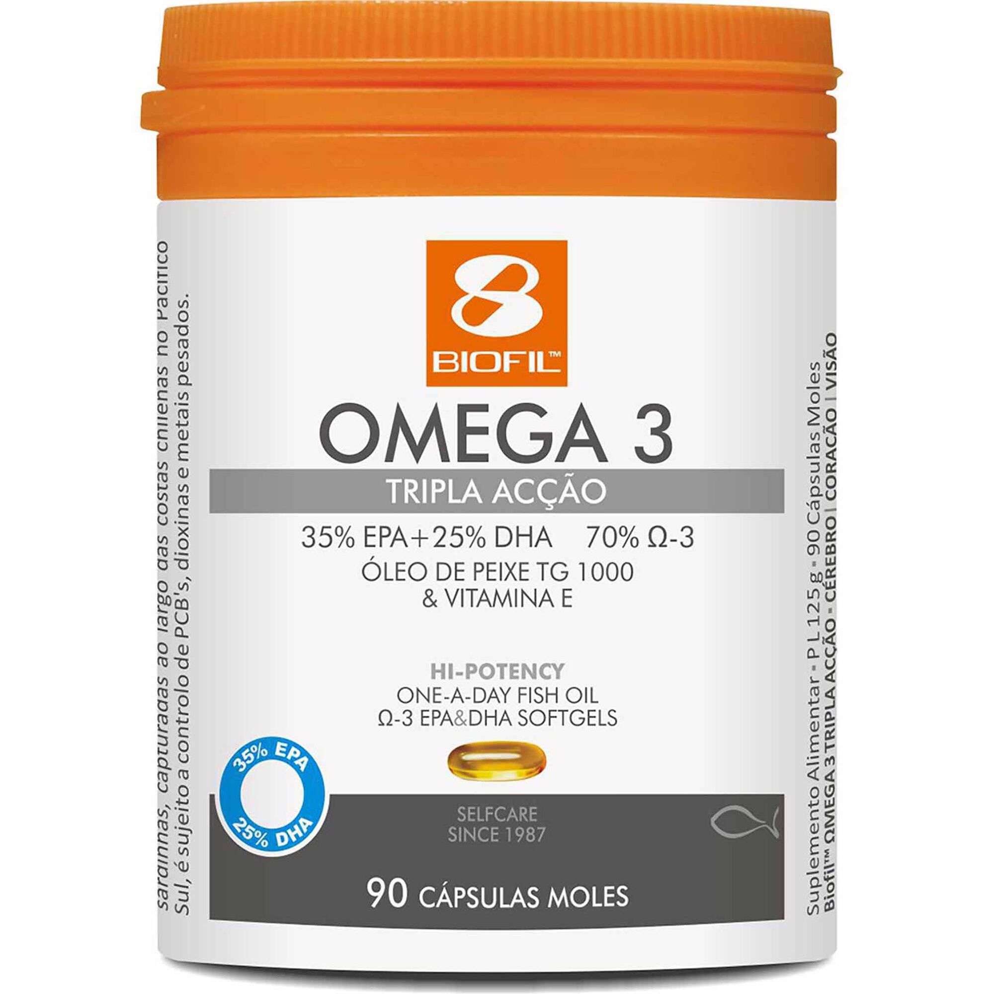 Biofil Omega-3 1000 Tripla Acção Cérebro, Coração e Visão: Contém 1 g de óleo de peixe por toma diária, garantindo a ingestão de 600 mg de PUFA 3 Epa+Dha, sendo 250 mg de DHA. O DHA contribui para a manutenção de uma normal função cerebral e de uma visão normal. O EPA e o DHA contribuem para o normal funcionamento do coração. Suplemento alimentar.