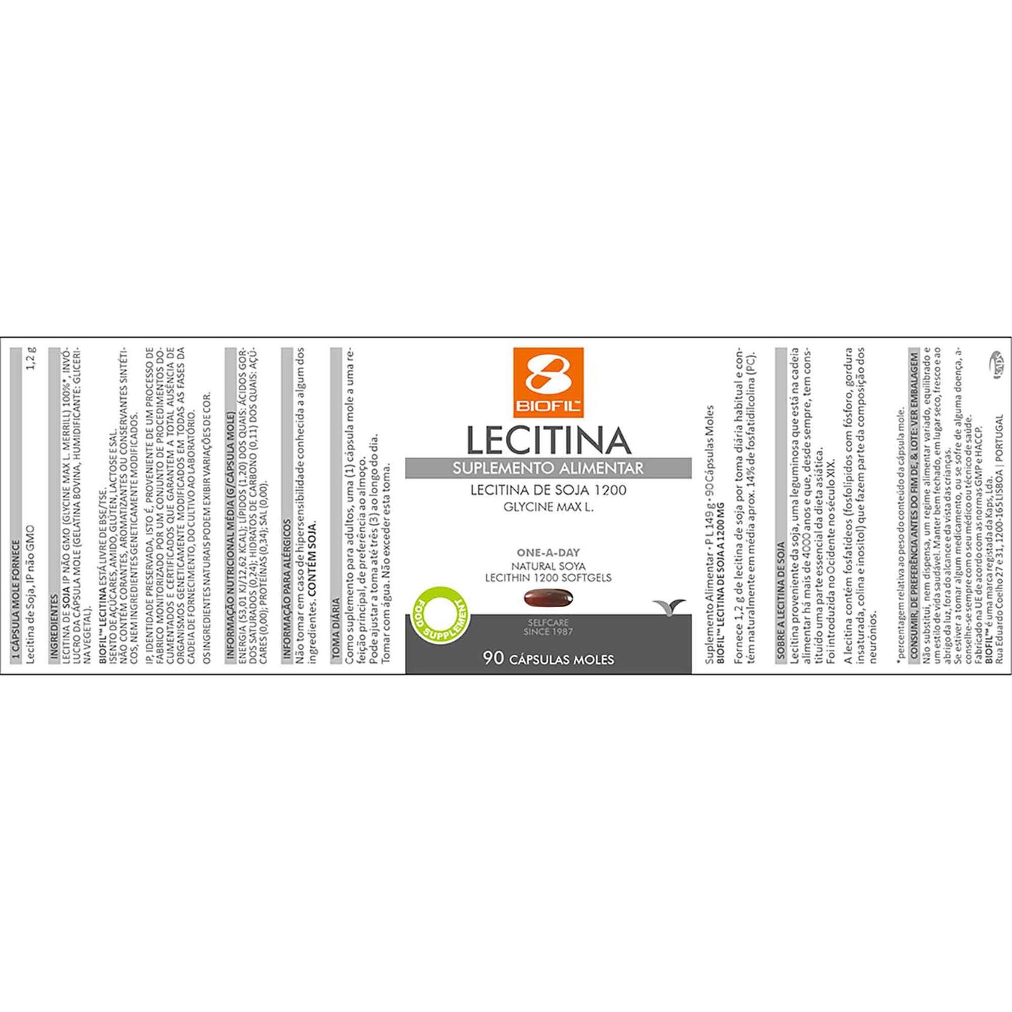 Biofil Lecitina de Soja 1200 14% PC . A lecitina de soja contém fosfatidos (fosfolípidos com fósforo, gordura insaturada, colina e inositol) que fazem parte da composição dos neurónios. A colina contribui para o normal metabolismo dos lípidos e para a manutenção de uma função hepática normal. Suplemento alimentar