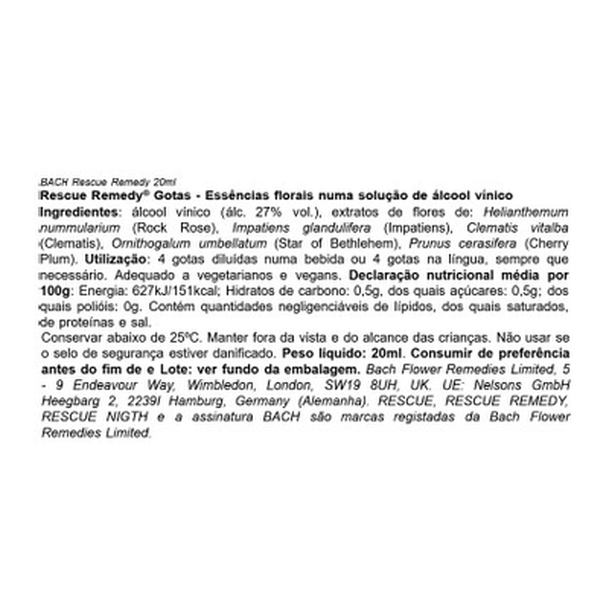 Em Gotas, o Rescue Remedy é completamente natural e contém 5 dos 38 remédios florais de Bach originais: Rock Rose para o terror e o pânico; Impatiens para a irritação e a impaciência; Star of Bethlehem para o choque; Clematis para a falta de concentração; Cherry Plum para os pensamentos irracionais. Suplemento Alimentar.